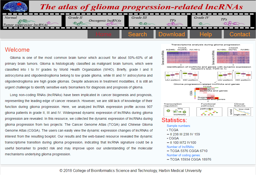 Long non-coding RNAs (lncRNAs) have been implicated in cancer biogenesis and prognosis, representing the leading edge of cancer research. However, we are still lack of knowledge of their function during glioma progression. Here, we analyzed lncRNA expression profile across 907 glioma patients in grade II, III and IV. Widespread dynamic expression of lncRNAs during glioma progression are revealed. In this resource, we collected the dynamic expression of lncRNAs during glioma progression from two projects: The Cancer Genome Atlas (TCGA) and Chinese Glioma Genome Altas (CGGA). The users can easily view the dynamic expression changes of lncRNAs of interest from the resulting boxplot. Our results and the web-based resource revealed the dynamic transcriptome transition during glioma progression, indicating that lncRNA signature could be a useful biomarker to predict risk and may improve upon our understanding of the molecular mechanisms underlying glioma progression.