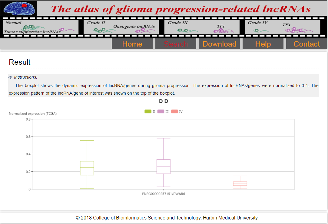 The boxplot shows the dynamic expression of lncRNA/genes during glioma progression. The expression of lncRNAs/genes were normalized to 0-1. The expression pattern of the lncRNA/gene of interest was shown on the top of the boxplot.
