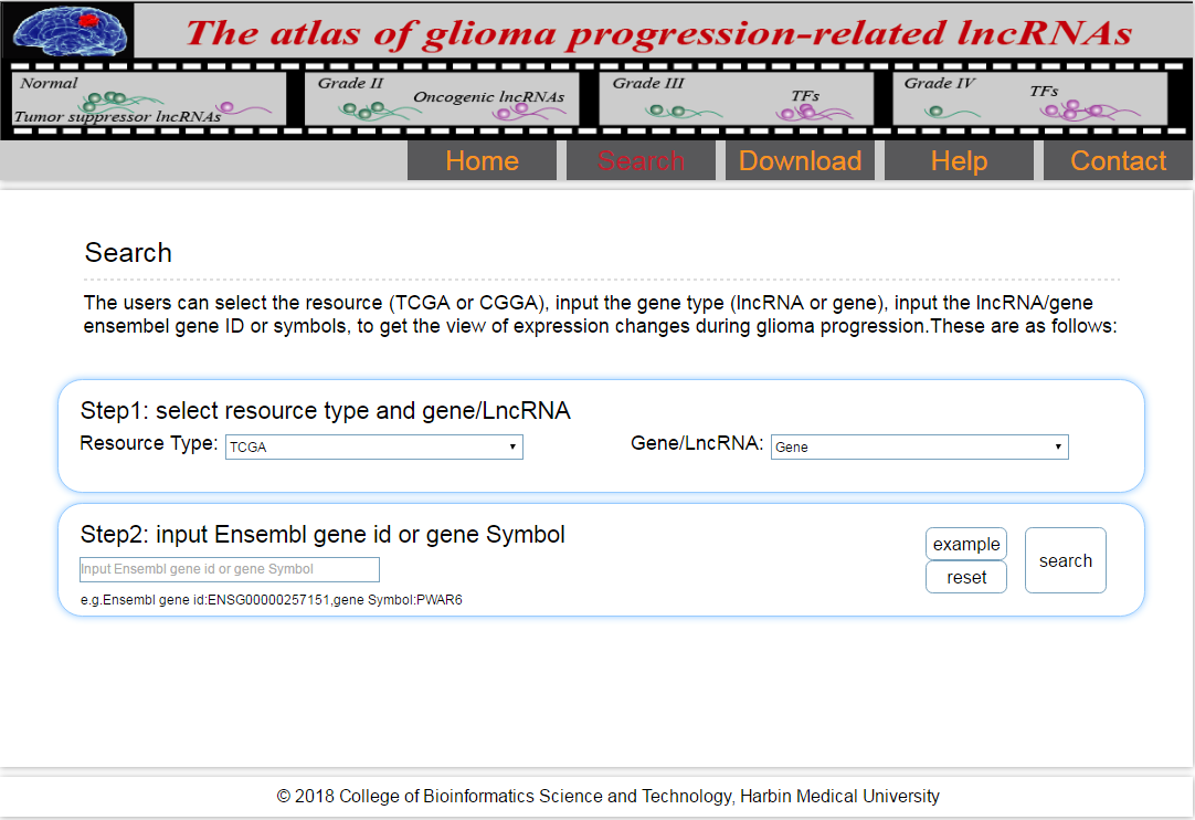 Users could select the menu "Search" to search data in the database. Users should select resource and gene or lncRNA at first, input Ensembl gene id or gene Symbol at second to search.