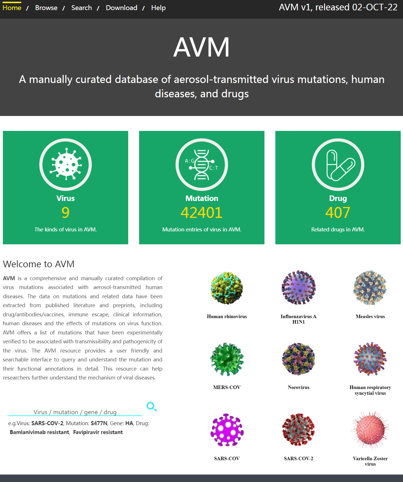 1. Users can input a virus, mutation or gene name to query related associations in AVM.