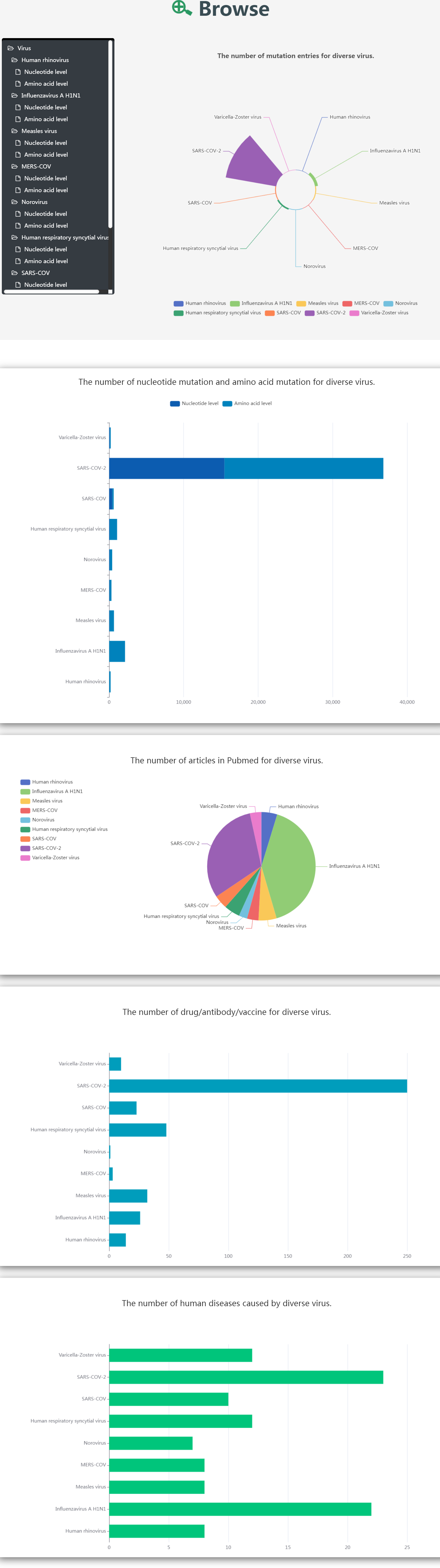 In the Browse page, there are some ways to browse all mutation data across nine viruses.