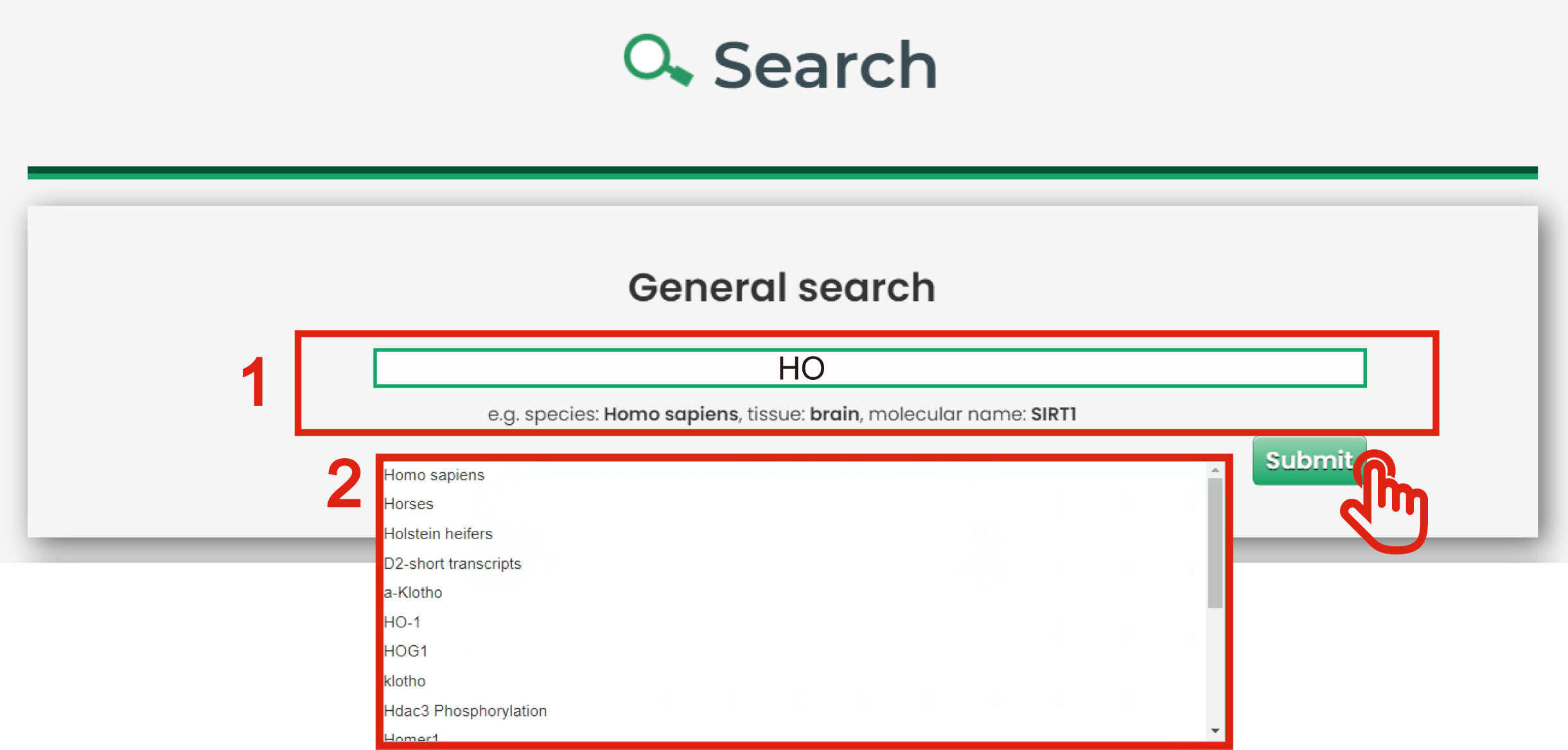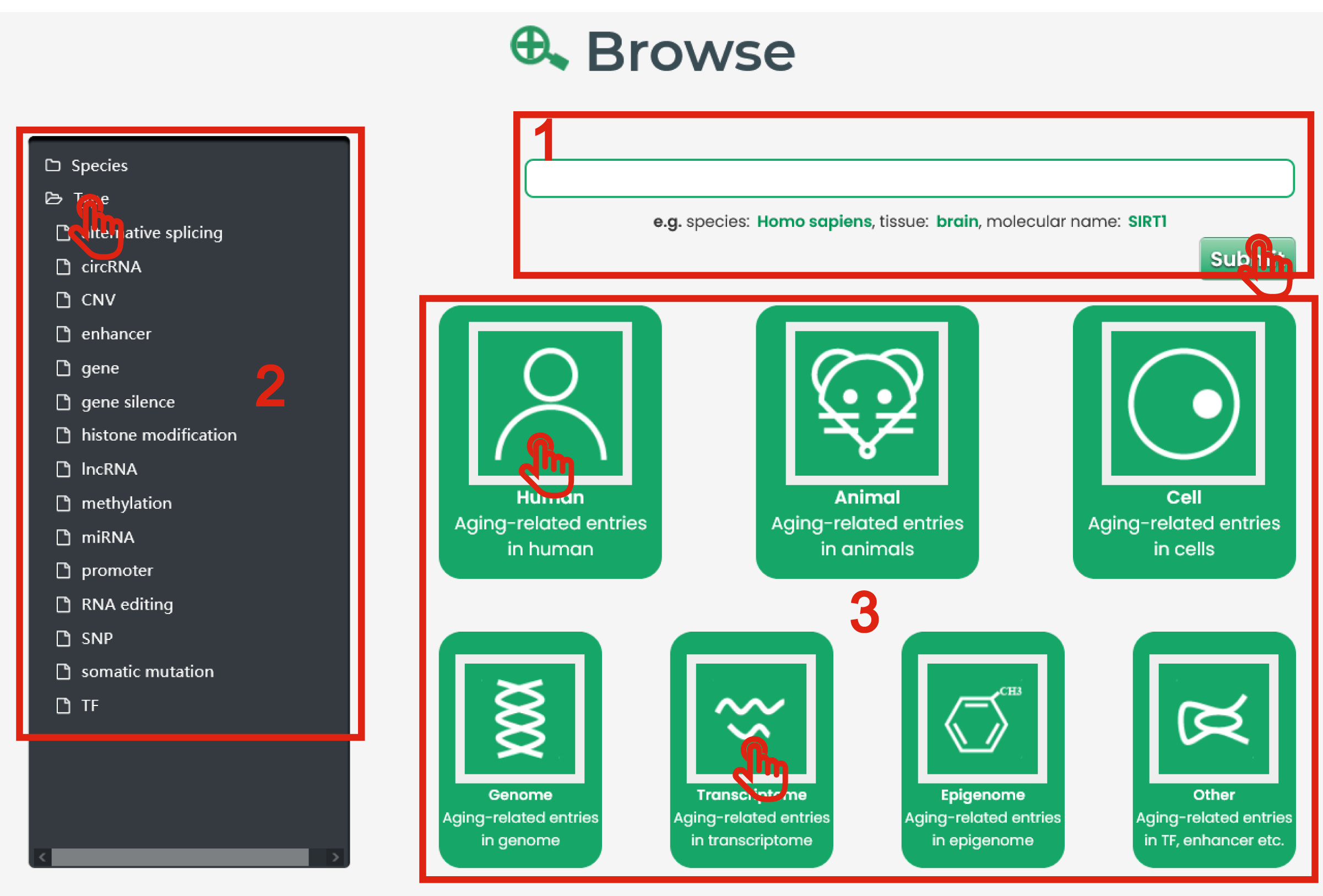 In the Browse page, there are three ways to search by aging-related experimentally verified data.