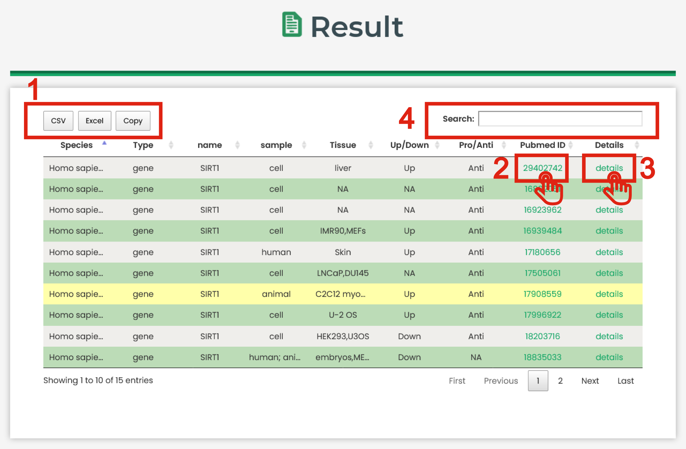 4. After step 1, 2 or 3, you will get the result page with the target entries.