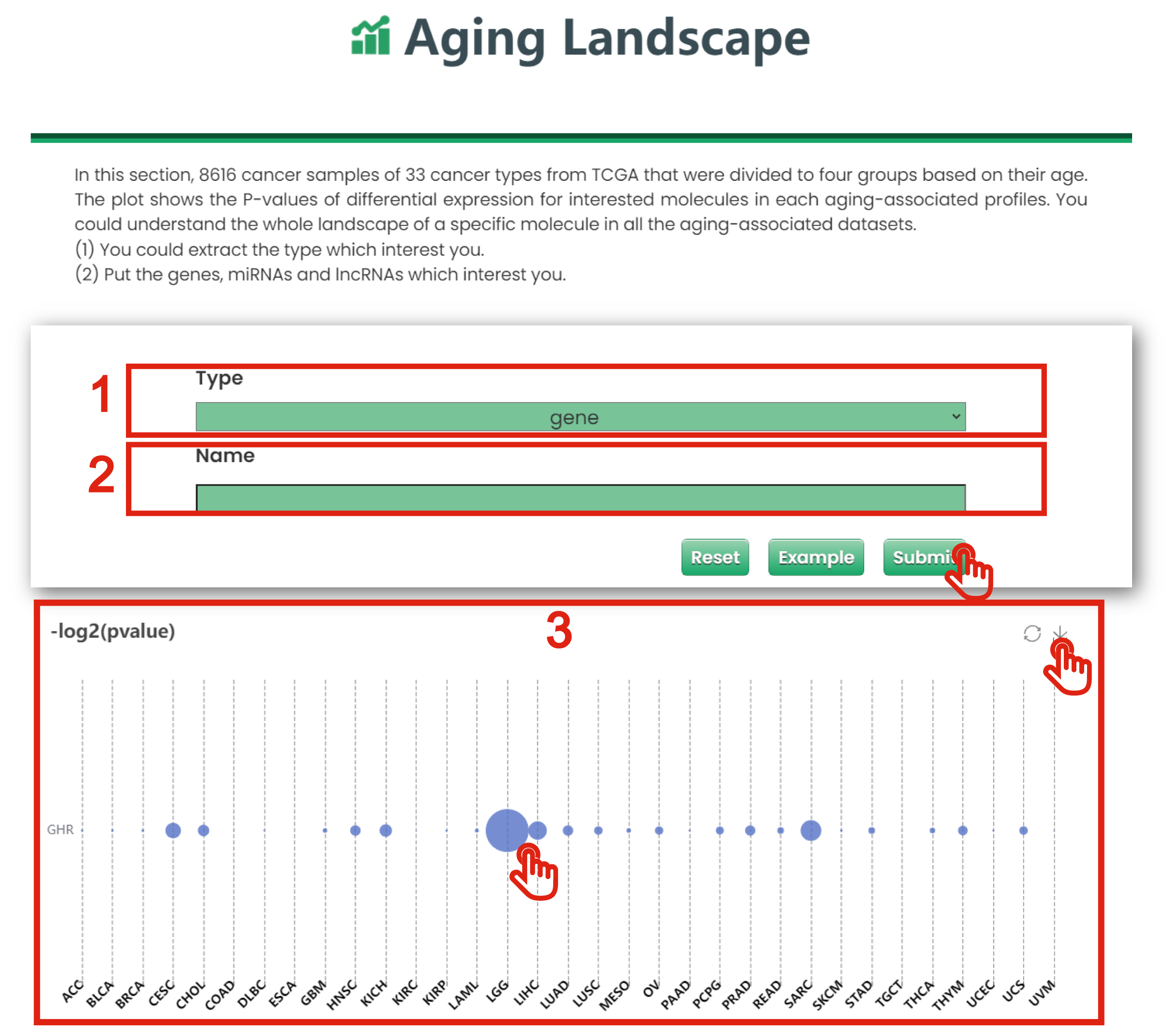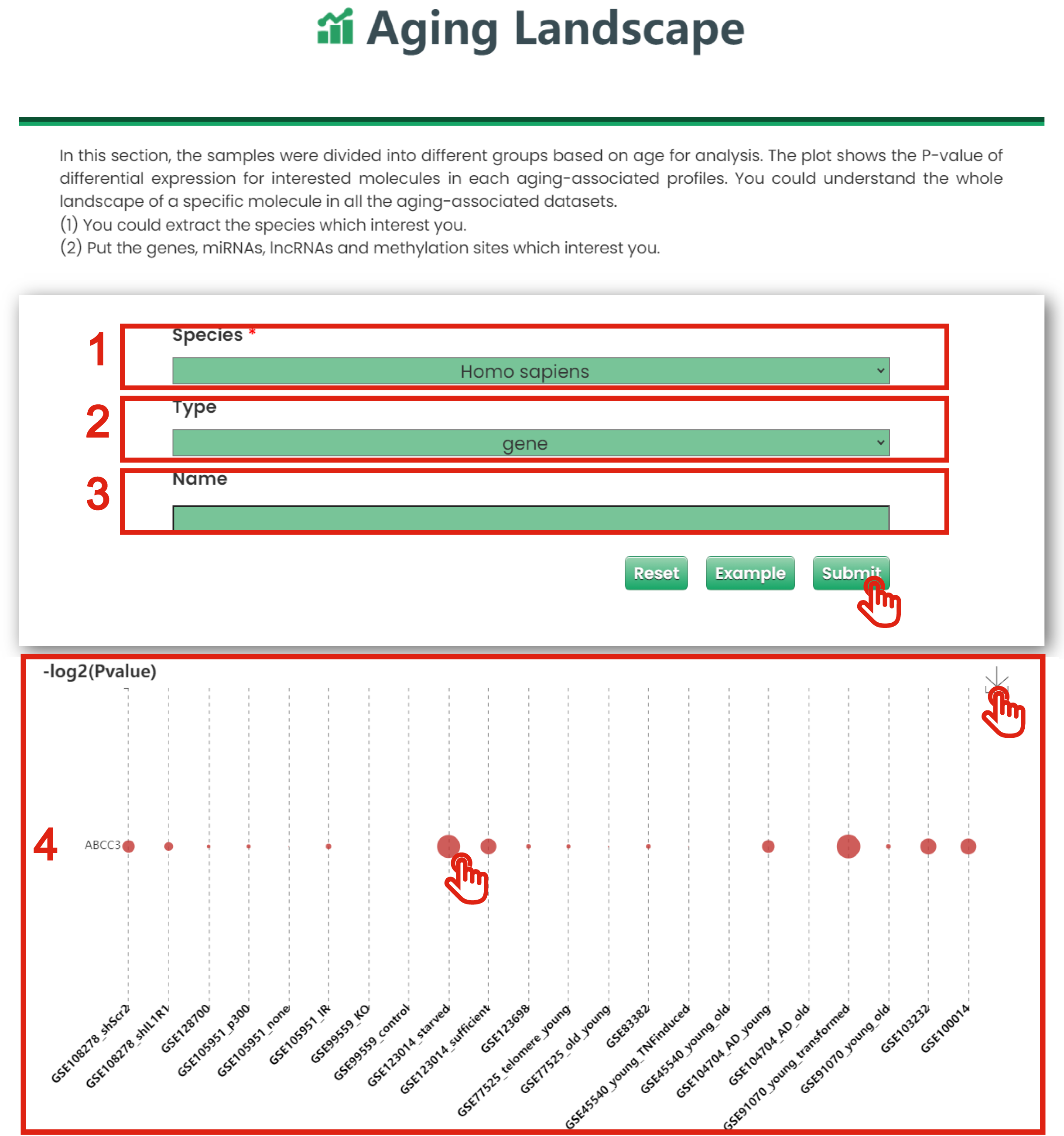 3. The plot shows the P-values of differential expression for interested molecules in each aging-associated profiles. You could understand the whole landscape of a specific molecule in all the aging-associated datasets.