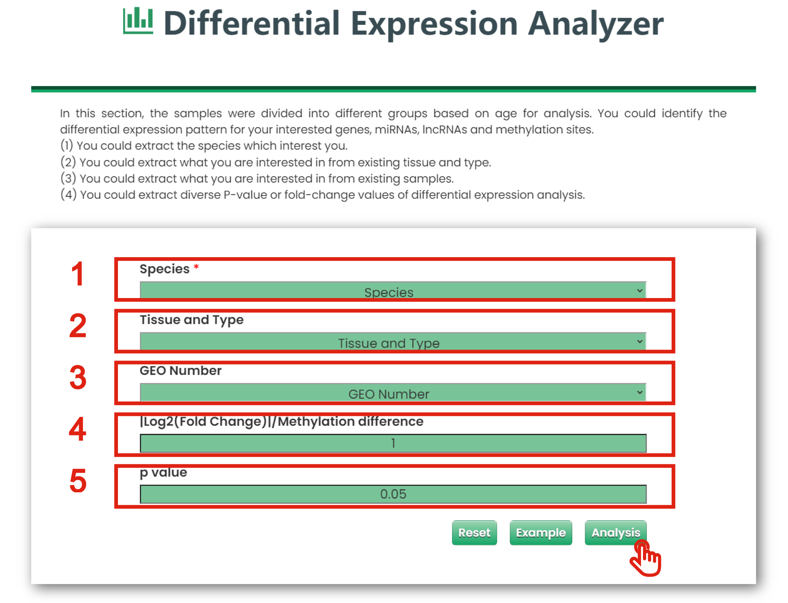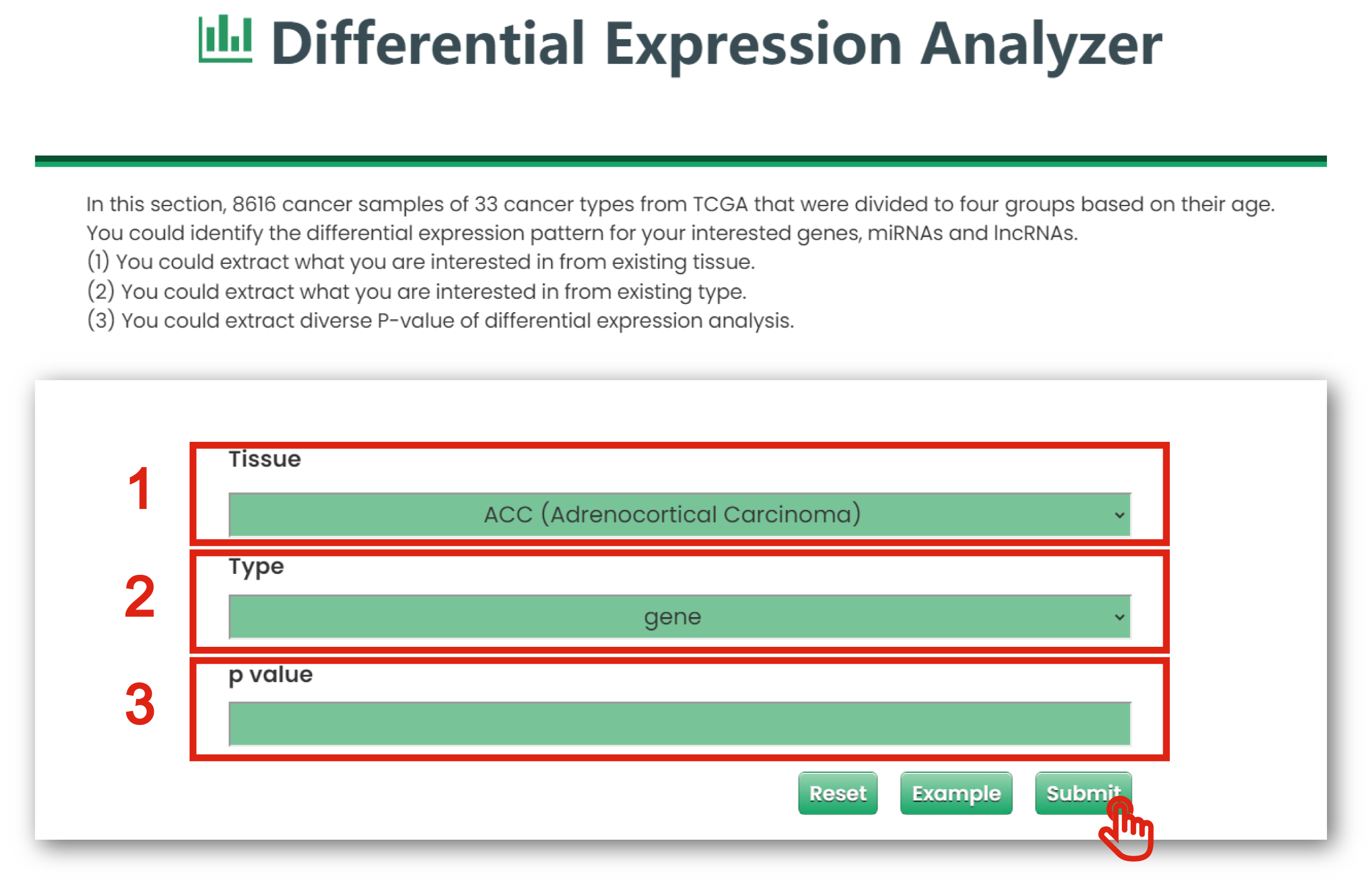 The Differential Expression Analyzer page of Cancer & Aging is displayed in Figure 7-2: