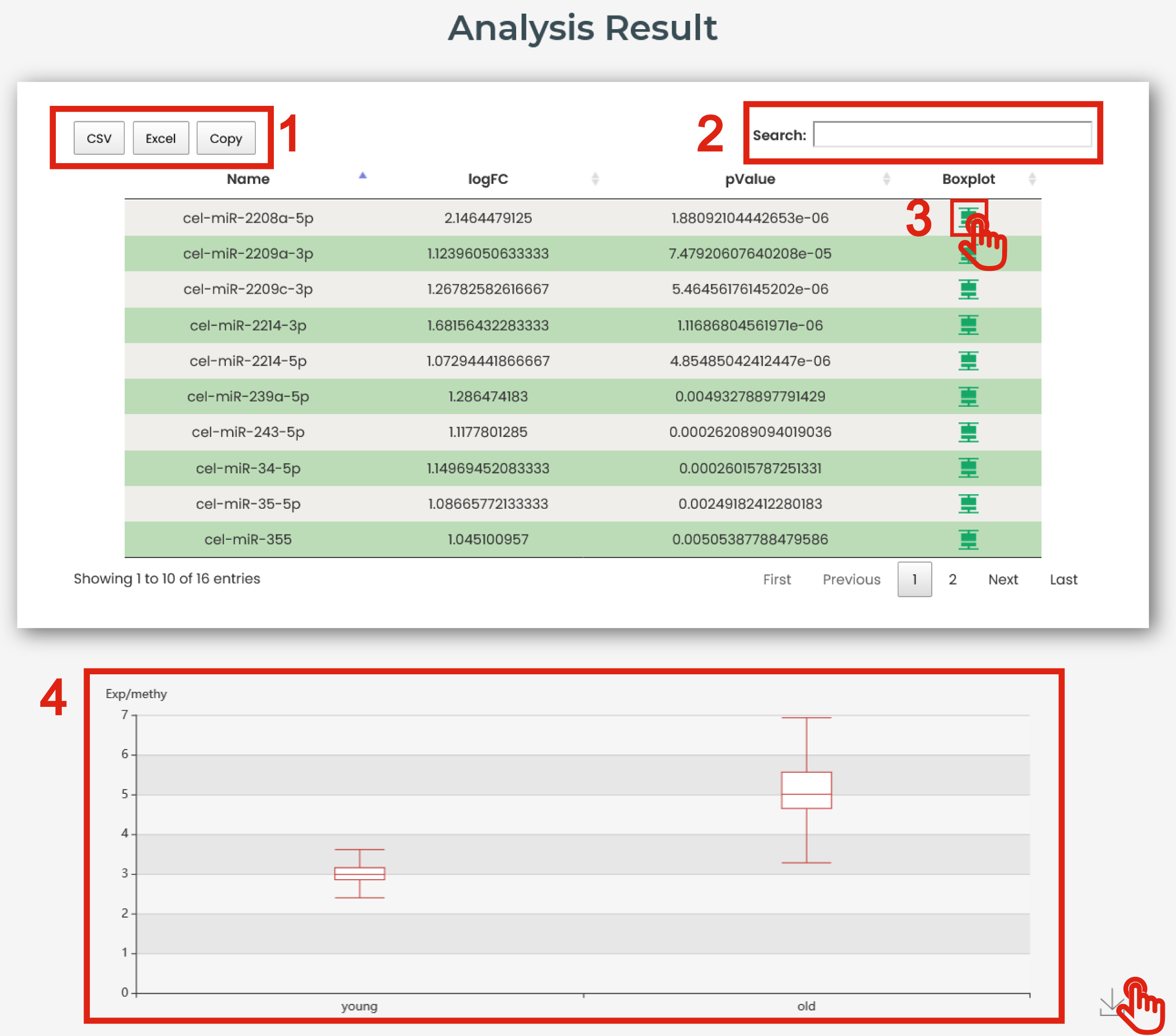 In this section, you could identify the differential expression pattern for your interested genes, miRNAs, lncRNAs and methylation sites in aging-related GEO datasets.
