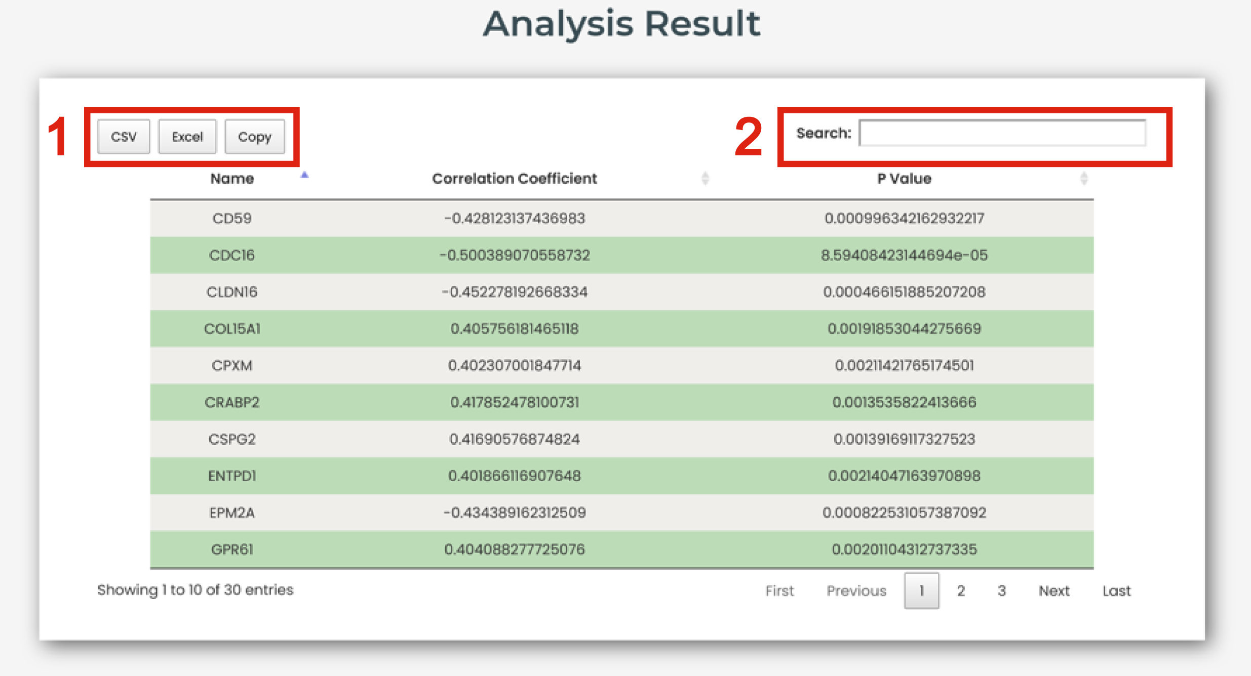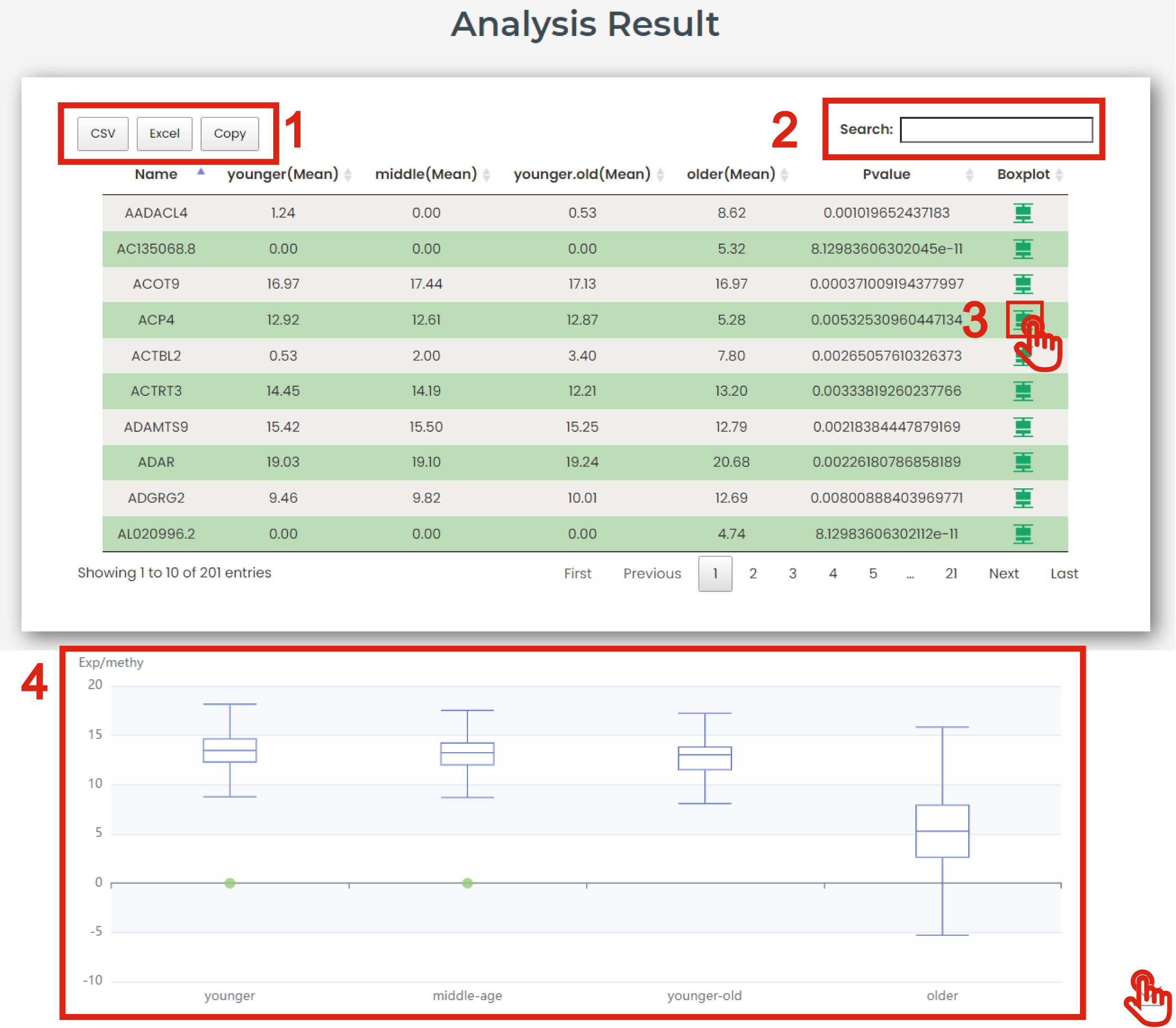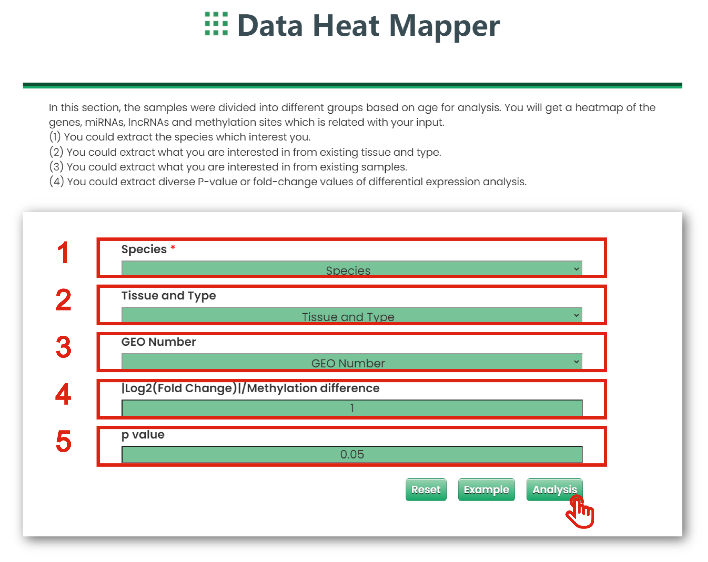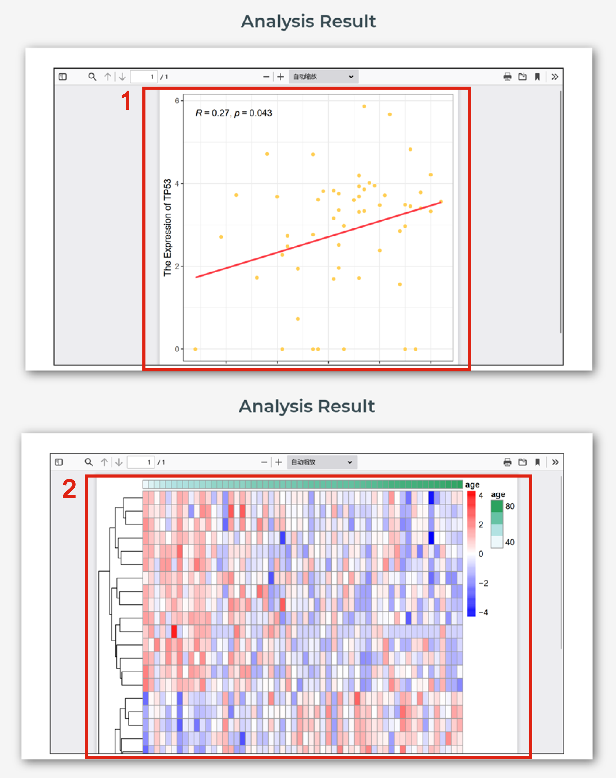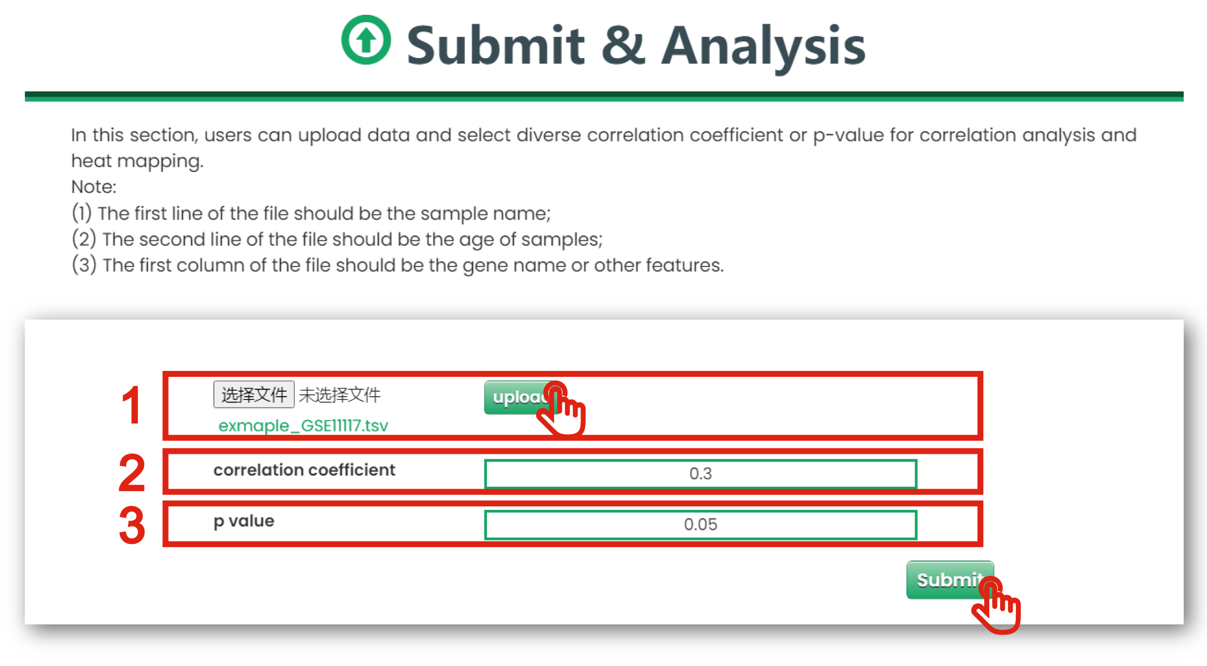 In this section, users could upload data for correlation analysis of interested molecules with age, and visualize them with heatmaps and correlation scatter plots.
