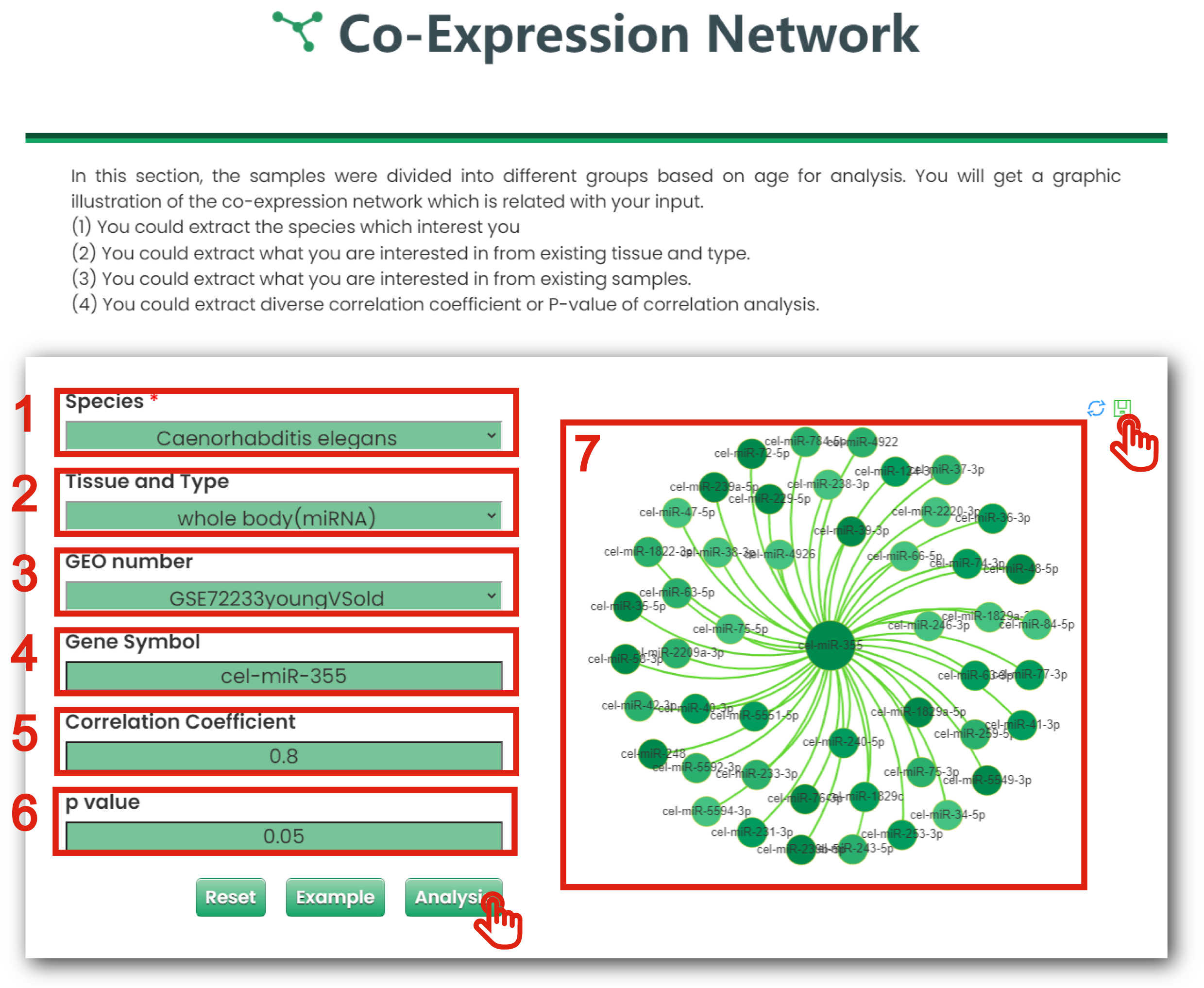 In this section, you will get a graphic illustration of the co-expression network which is related with your input based on aging-related GEO datasets.