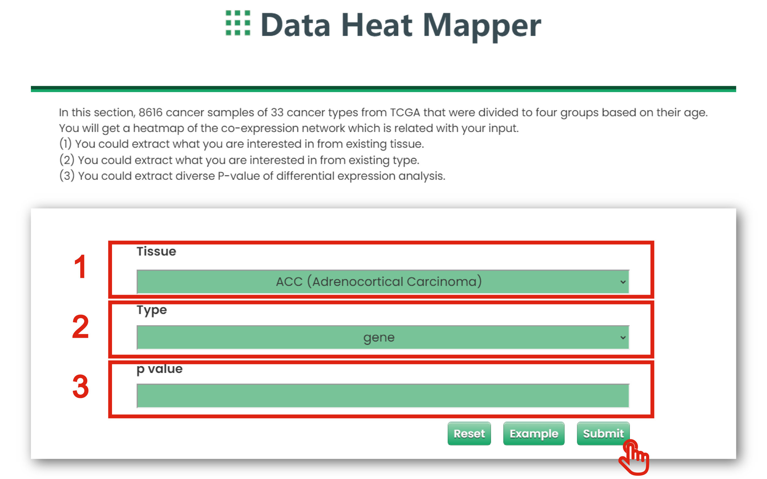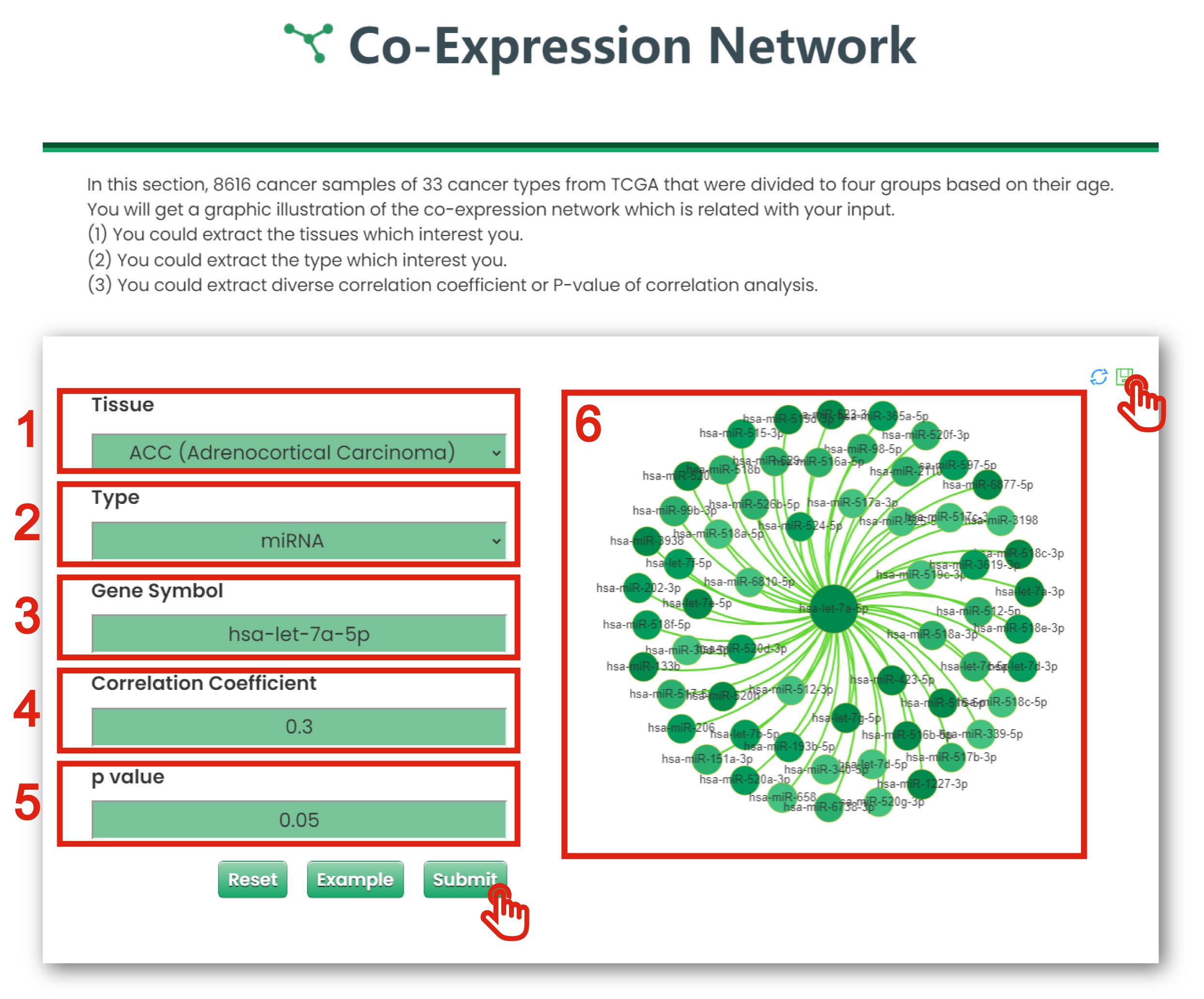 In this section, you will get a graphic illustration of the co-expression network which is related with your input based on age-grouped cancer datasets of TCGA.
