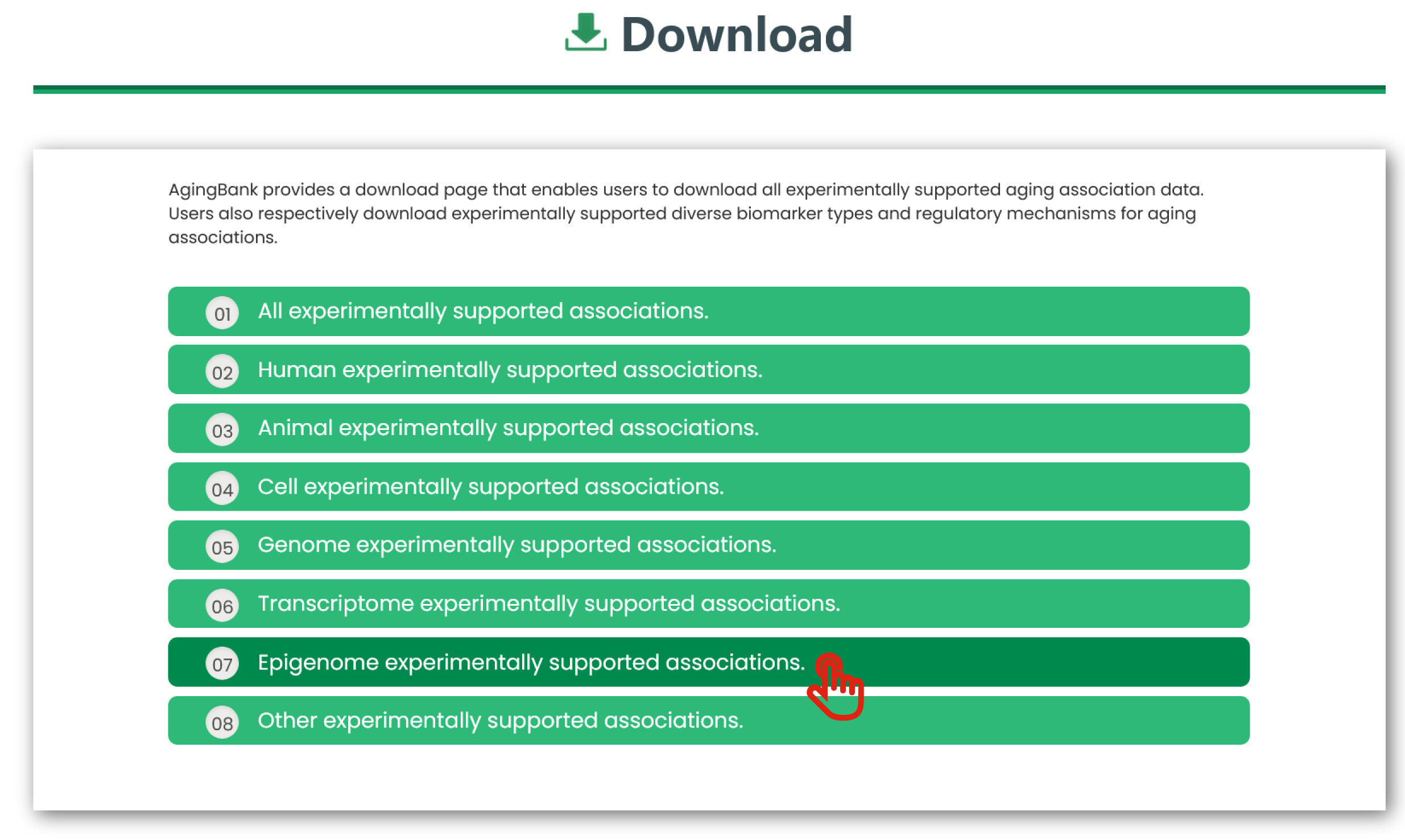 Users could download experimentally supported diverse biomarker types and regulatory mechanisms for aging associations.