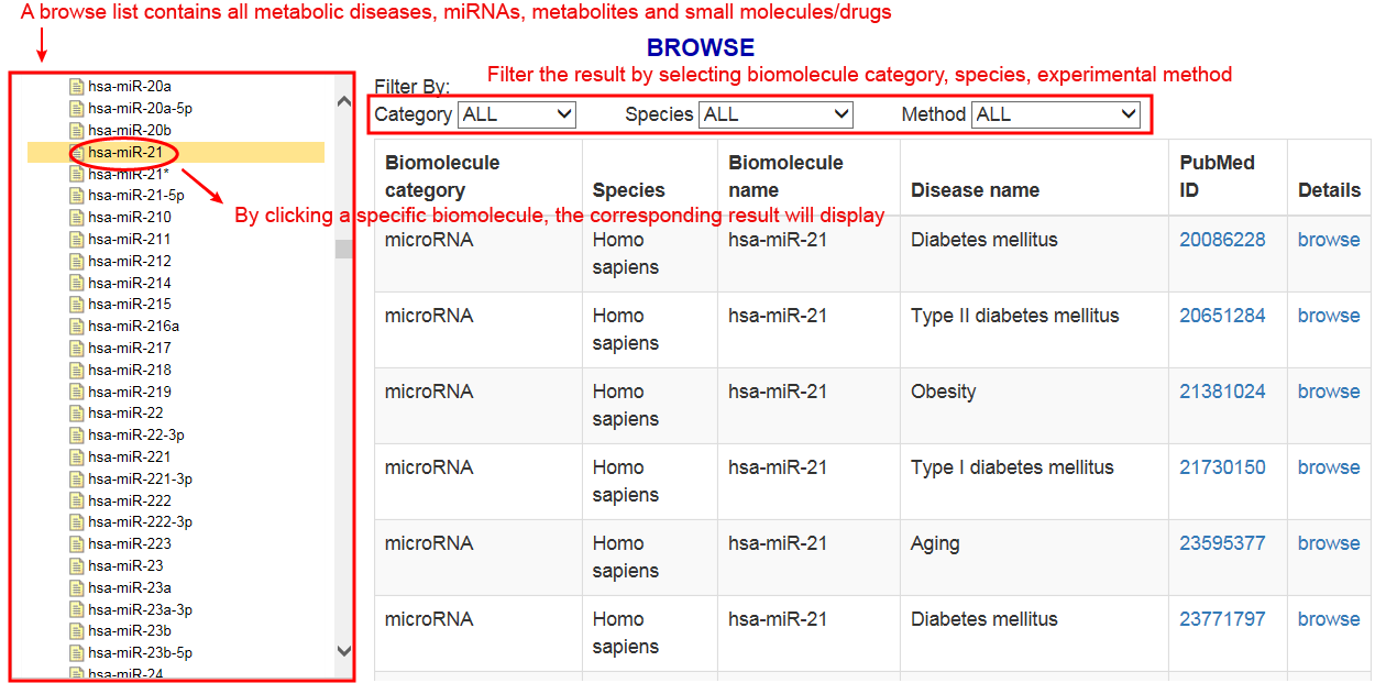 In the Browse page, users can browse the biomolecule–metabolic disease associations by clicking a specific miRNA, metabolite, small molecule/drug. Then, users can filter the results by selecting a specific biomolecule category, species, experimental method, etc. and a corresponding results table will display.