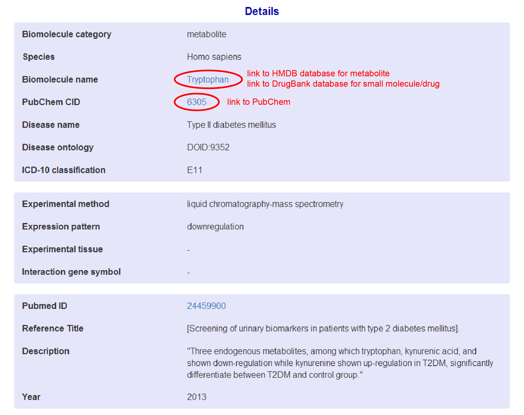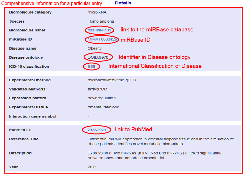 To get detailed information on BioM2MetDisease needs to click on the "details" button of the data table. It will open another page to show a comprehensive information of the selected entry. In addition, hyper link to the reference and other databases (miRBase, HMDB, PubChem, DrugBank, etc.) are provided.