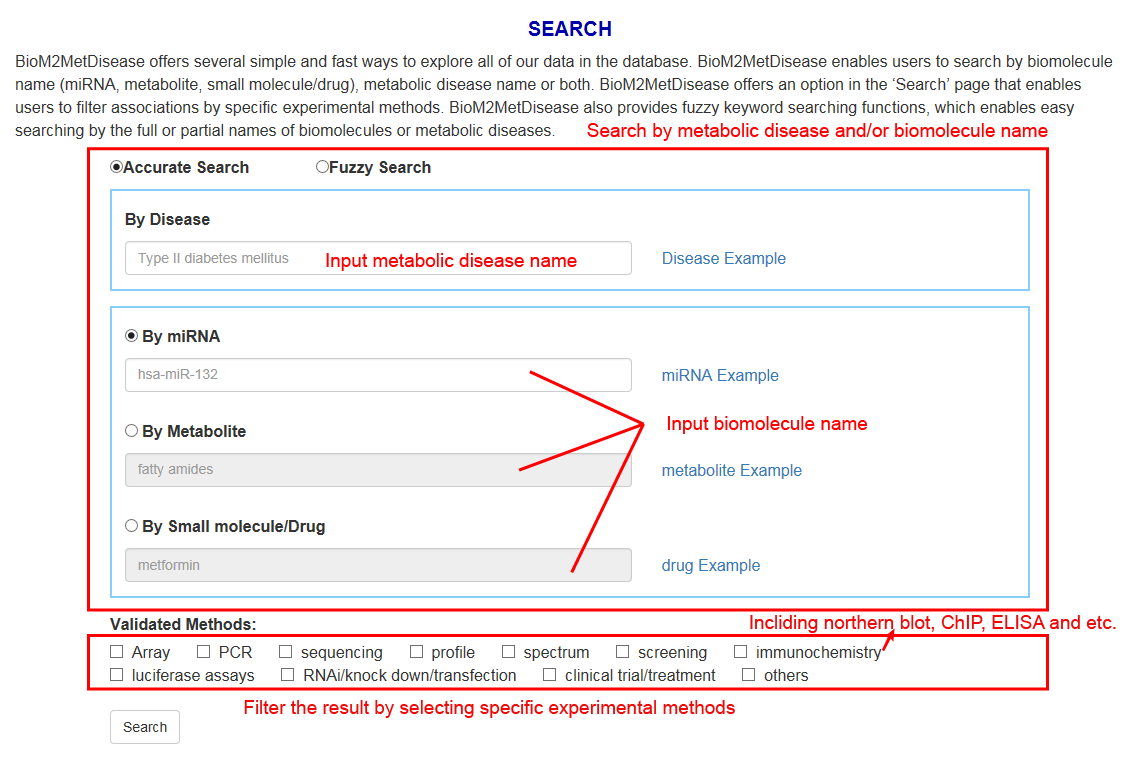 In the Search page, users can search by a specific metabolic disease name or a biomolecule name (miRNA, metabolite, small molecule/drug). Users can also search by inputting both biomolecule (miRNA, metabolite, small molecule/drug) and metabolic disease name. BioM2MetDisease provides an option in the ‘Search’ page that enables users to filter associations by specific experimental methods. BioM2MetDisease offers a ‘fuzzy search’ function for the entries by the full or partial names of biomolecules and/or metabolic diseases.