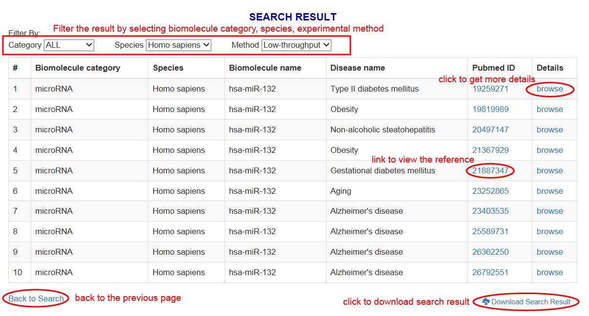 There is a data table shows when users initiate a search request. Each entry contains the information about biomolecule (miRNA, metabolite, small molecule/drug), metabolic disease and their relationships, including Biomolecule category, Species, Biomolecule name, Disease name, PubMed ID and details. Users can click on the "Download Search Result" button to download the data table and the "details" button to view a comprehensive information about this entry.