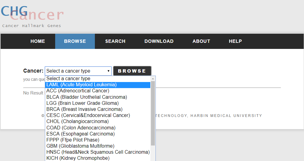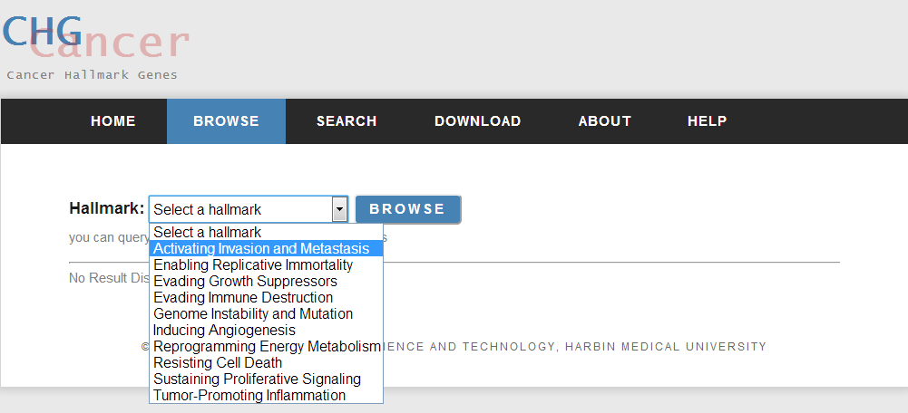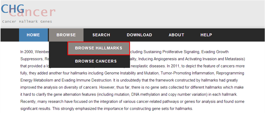 CHG database is focused on integrating and annotating Hallmark features’ potential roles in human cancer processes. According to the key words from 3 different professional experts to determine the Hallmark characteristics, based on the method of text mining from KEGG and other databases to determine the Hallmark related pathways, as well as the associated genes in 34 types of cancer. The current release of CHG Database was collected 2838 genes (in 55 pathways) related to hallmarks. To help to promote the analysis of carcinogenesis, we comprehensive collected the driven mutation, differentially expression methylation and CNV gene data from TCGA, and mapped them into hallmarks and corresponding statistical analysis results including the frequency of mutation (e.g. missense, deletion, insertion etc.), methylation and CNV (e.g. loss or gain) in each genes. We analyzed the relationship among ten hallmarks and clustered them into four classes: 1) Reprogramming Energy Metabolism (REM). 2) Activating Invasion and Metastasis (AIM), Evading Growth Suppressors (EGS), Enabling Replicative Immortality (ERI) and Sustaining Proliferative Signaling (SPS). 3) Genome Instability and Mutation (GIM). 4) Tumor-Promoting Inflammation (TPI), Evading Immune Destruction (EID), Resisting Cell Death (RCD) and Inducing Angiogenesis (IA).