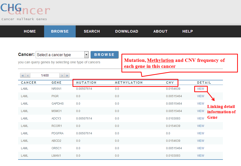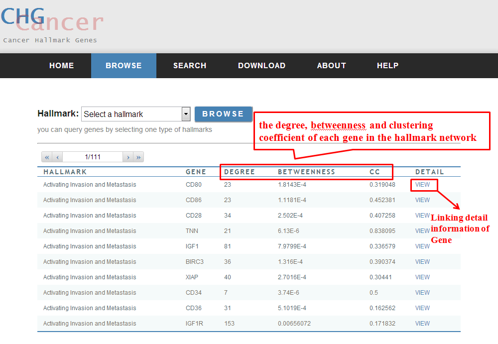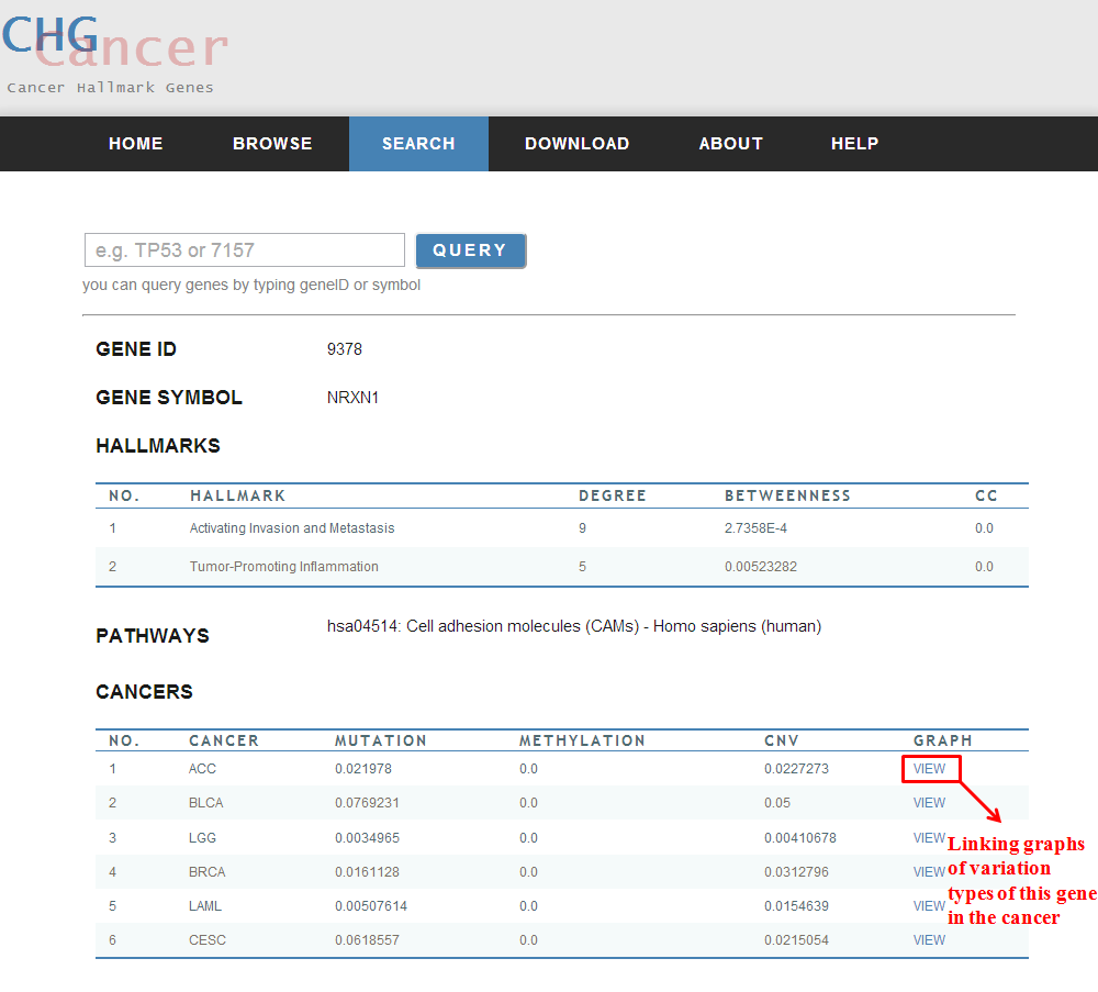 The database allows users to browse from two aspects, hallmark classification and tumor typing, and also provide users with a separate search interface to search for the genes of interest. For each gene in the database, we provide the following information: (1) Gene annotation information. These included mutation, methylation and copy number variation of Hallmark genes. (2) Network topology information. Structure the Hallmark genes interaction and regulatory network, and calculate the degree, clustering coefficient and betweenness centrality information of the gene in different hallmark networks. (3) The variation frequency information. Combined with the variation data in the TCGA, CHG calculated the frequency of gene of mutation, methylation and copy number variation in different cancer types, and graphical display respectively the proportion of different types of variation.