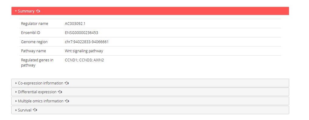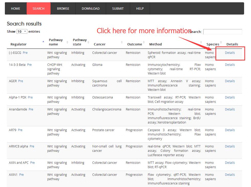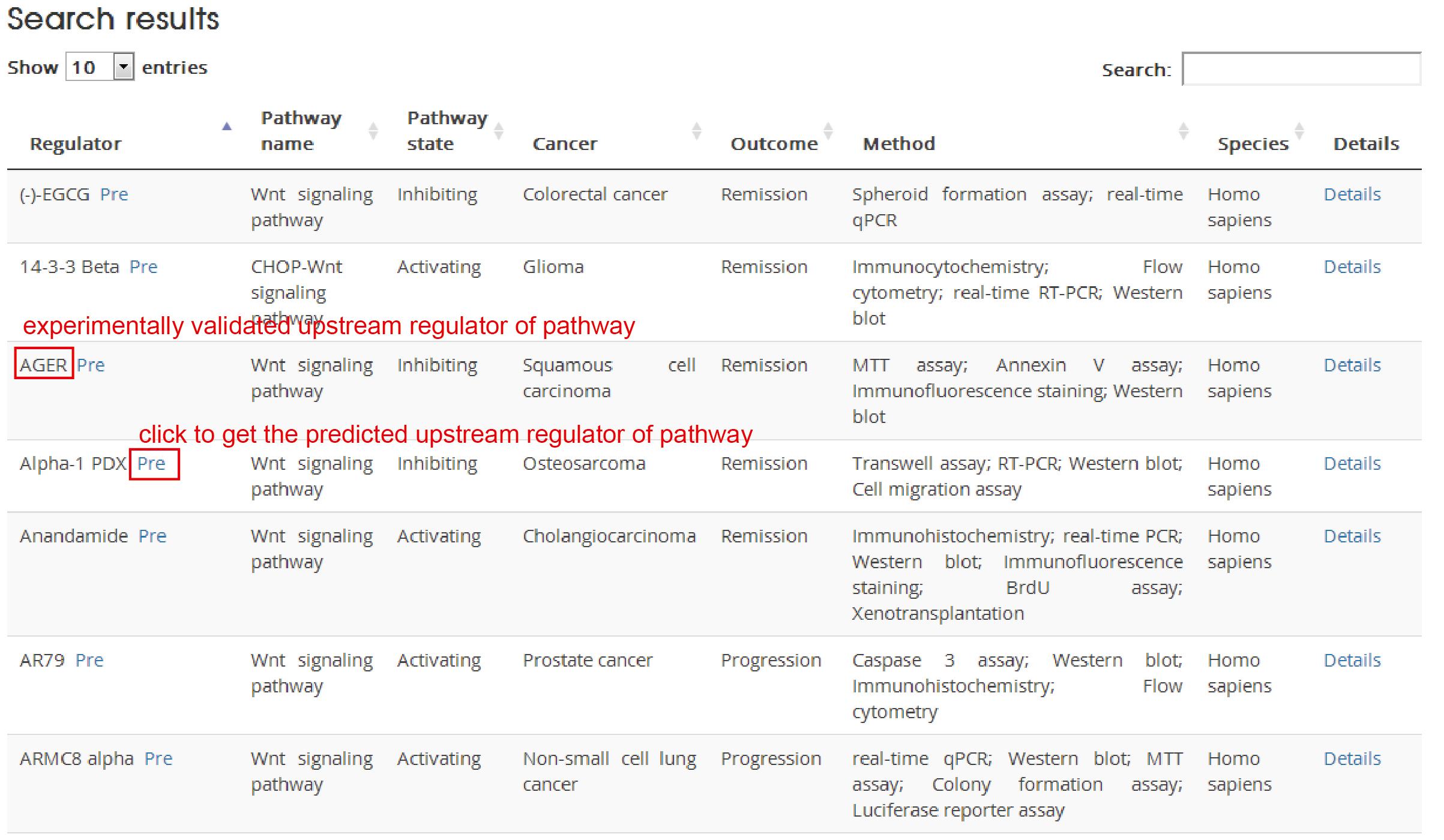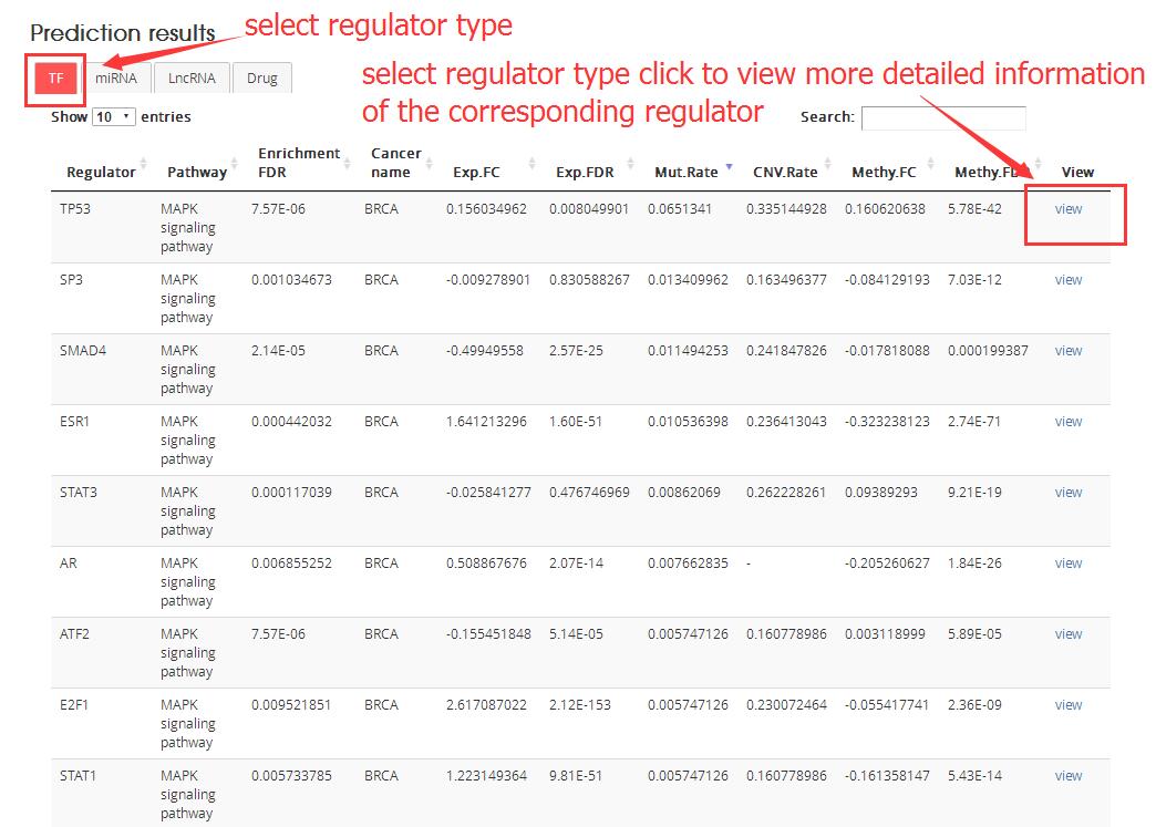 In the search/browse result table, click ‘pre’ to explore detailed information of predicted upstream regulators of cancer pathway.