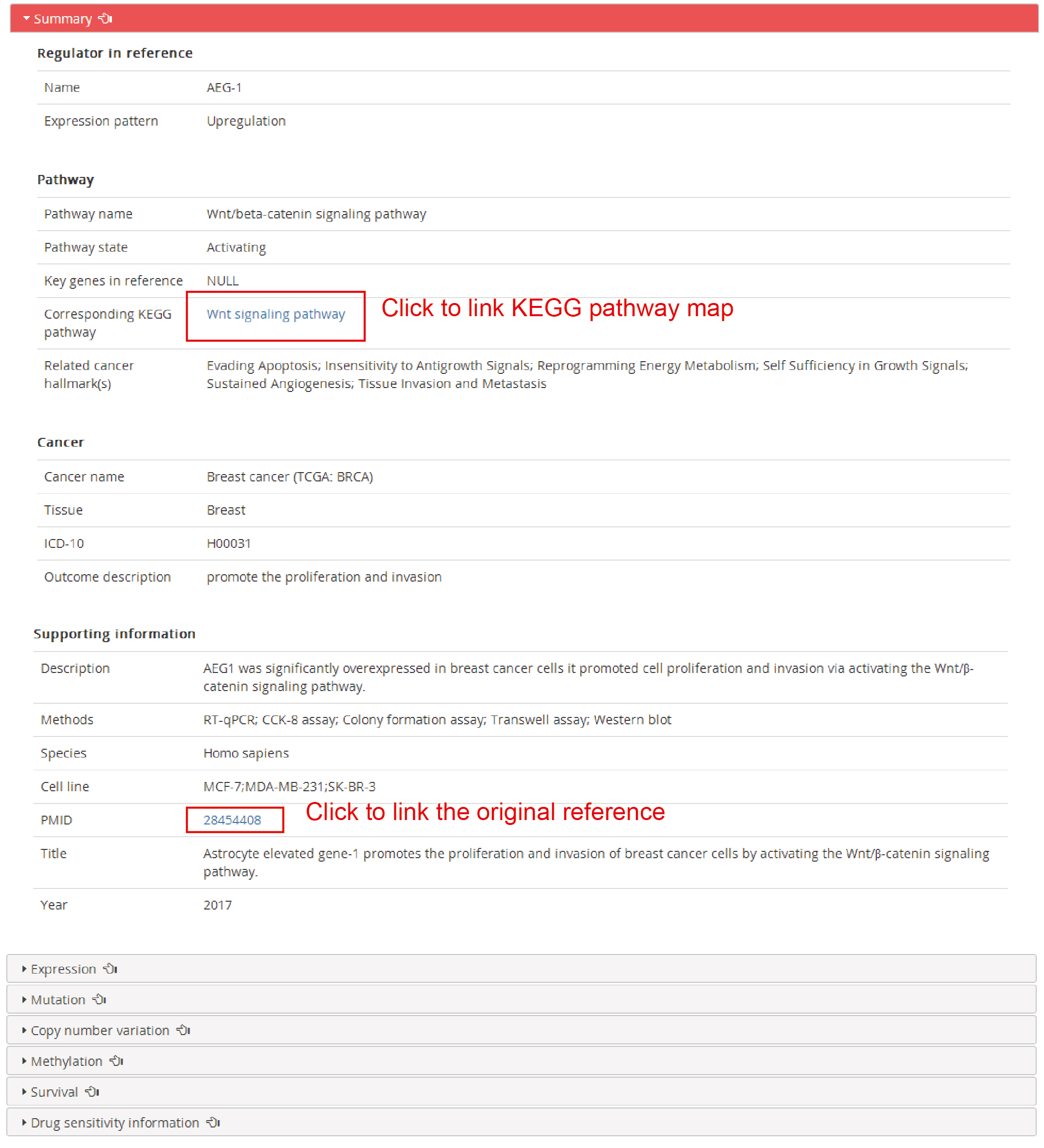 The detail framework including summary, expression, mutation, copy number variation, methylation, survival and drug sensitivity information.