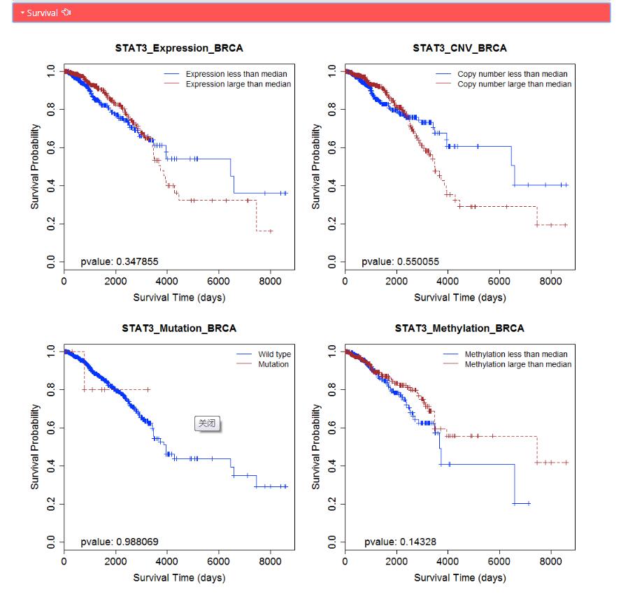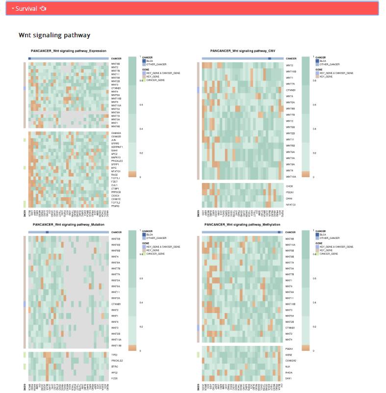 Survival: survival P values of corresponding KEGG pathway genes in TCGA pan-cancers based on four omics data in TCGA: expression data, copy number data, mutation data and methylation data.