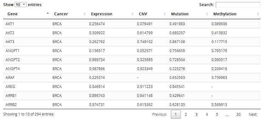 Prediction results: Predicted regulators for the cancer pathway and the dysregulated information at four omics level: expression, mutation, copy number and methylation.