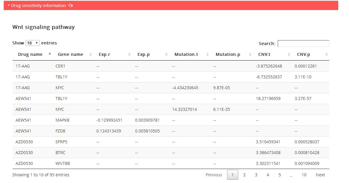 Drug sensitivity information: genes associated with drug sensitivity in corresponding KEGG pathway based on three omics data: expression data, mutation data and copy number data, and drug sensitivity data in CellMiner.