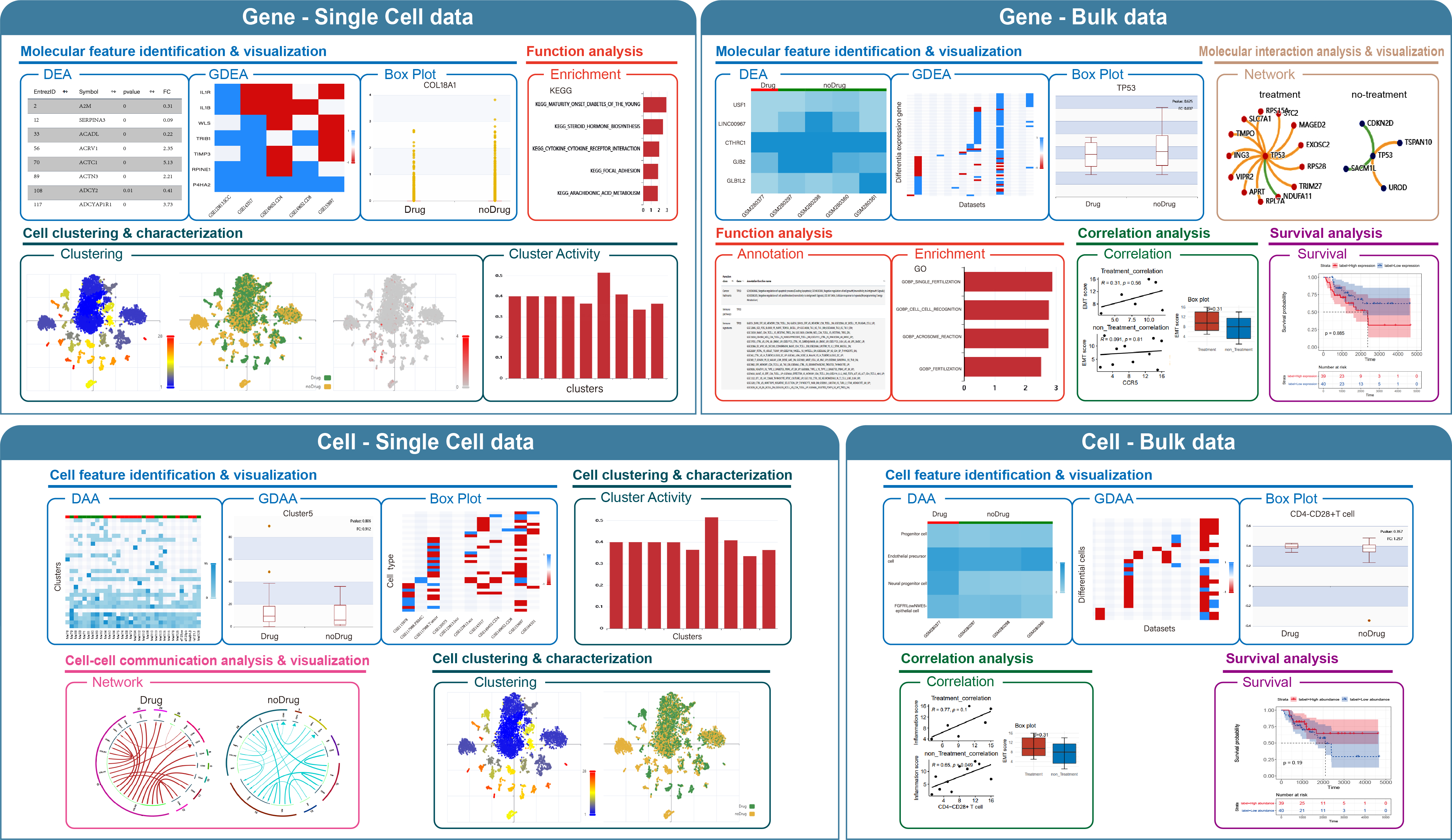 CiTSA also provides flexible online tools to identify and visualize molecular/cell feature and interaction, to perform function, correlation and survival analysis, and to execute cell clustering, cluster activity and cell-cell communication analysis based on single cell (307485 cells from 7 cancer types) and bulk (1045 samples from 16 cancer types) datasets. CiTSA provides a comprehensive and high-quality resource for studying biology molecules/cells act in tumor immunity and immunotherapy, and is helpful for understanding the molecular mechanism, discovering biomarkers, developing novel therapeutic targets and achieving the precision immunotherapy.