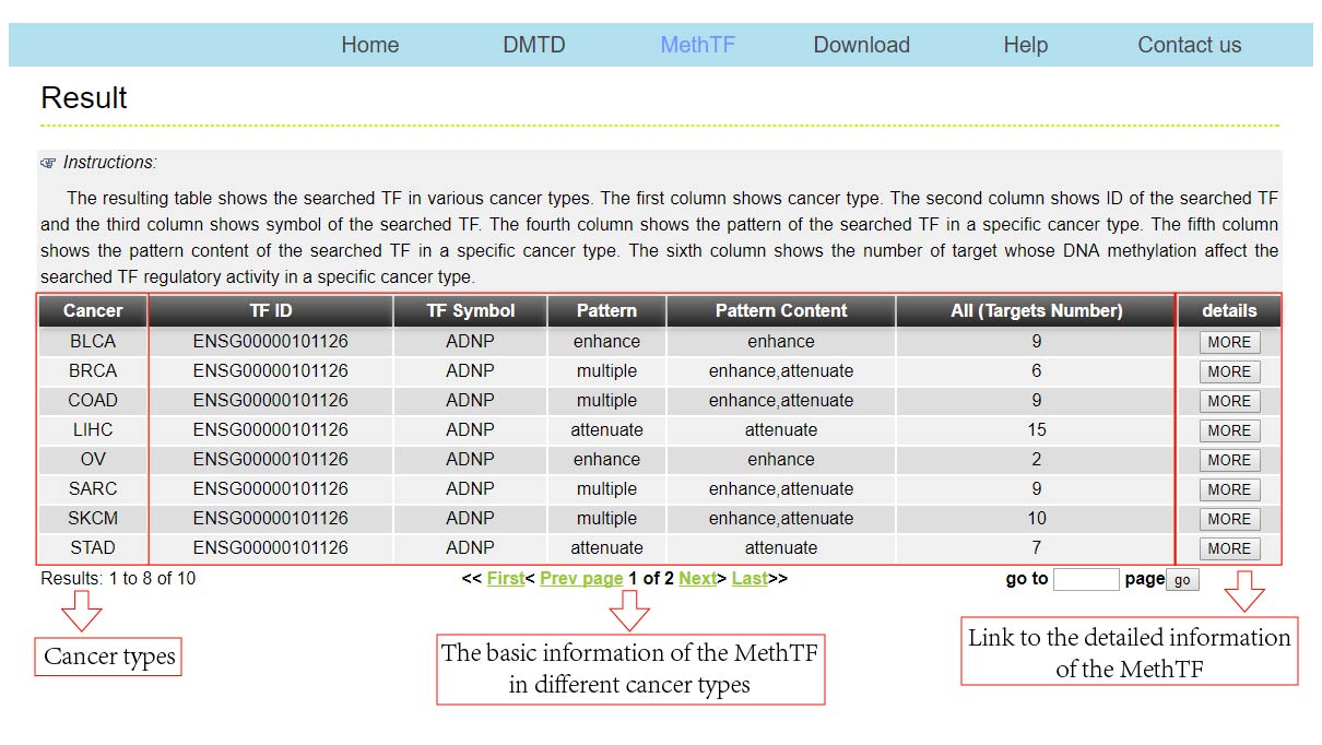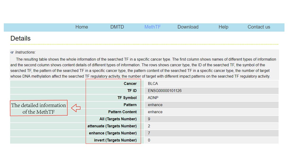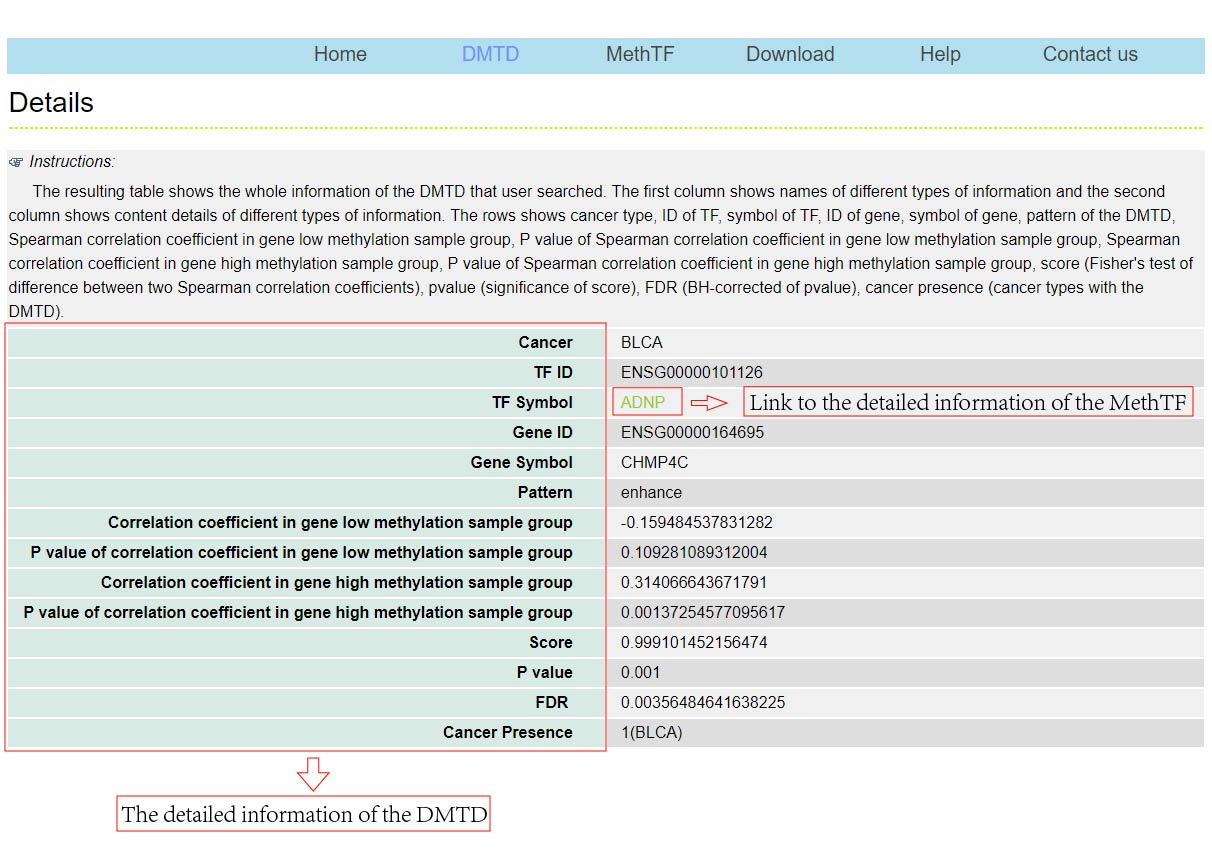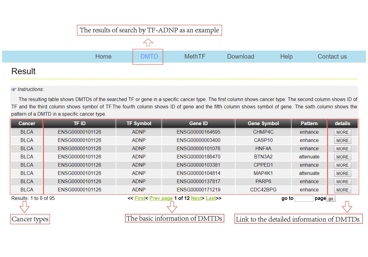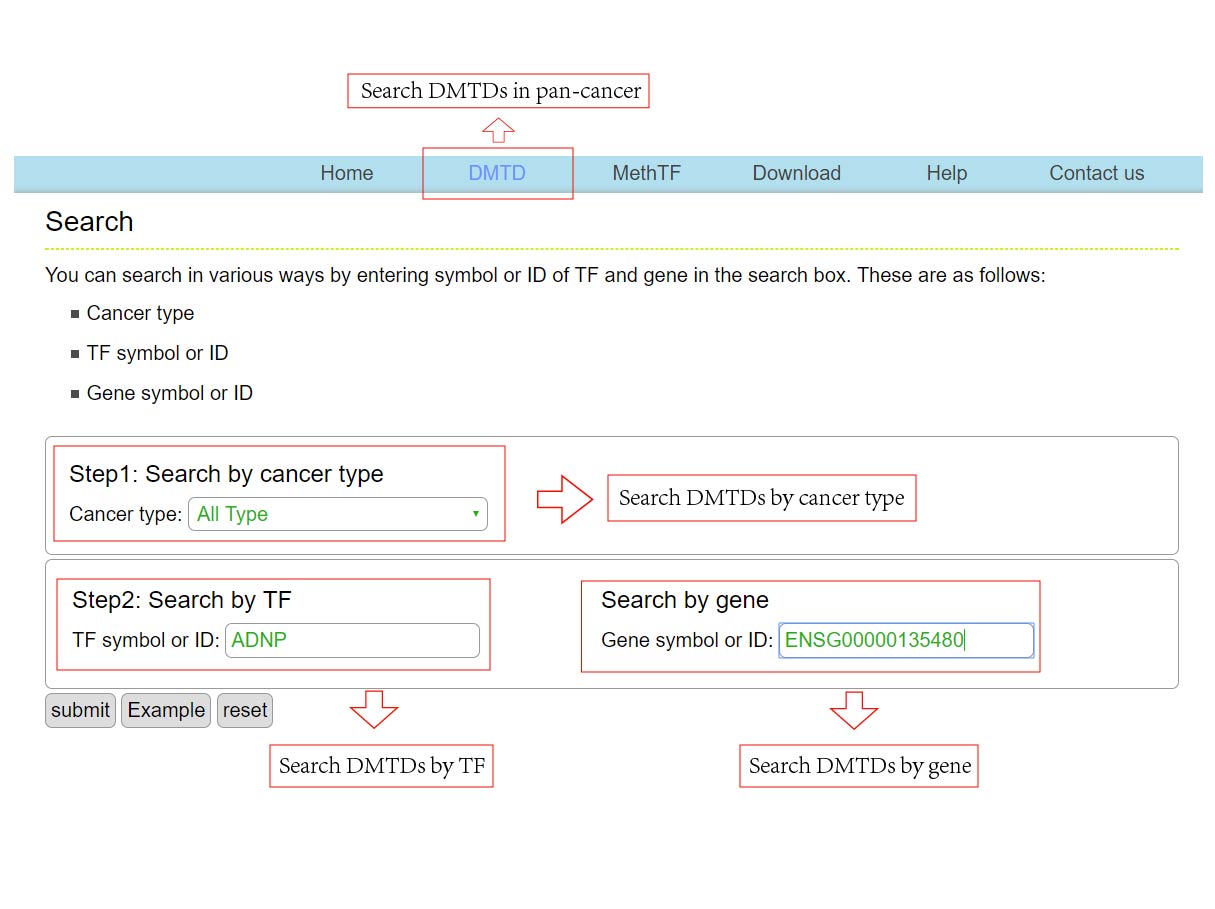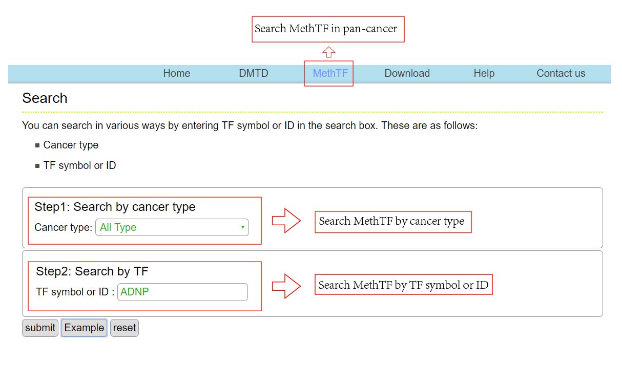 The DMTDB provides an interface to retrieve the information about the MethTFs in cancer. The current release of DMTDB mainly contains the results in 22 kinds of cancer. Users can search by individual TF to view the information of the MethTF in a certain cancer type. Here, we provide an example where users can click on "examples" and "submit", to check out the information about the MethTF.