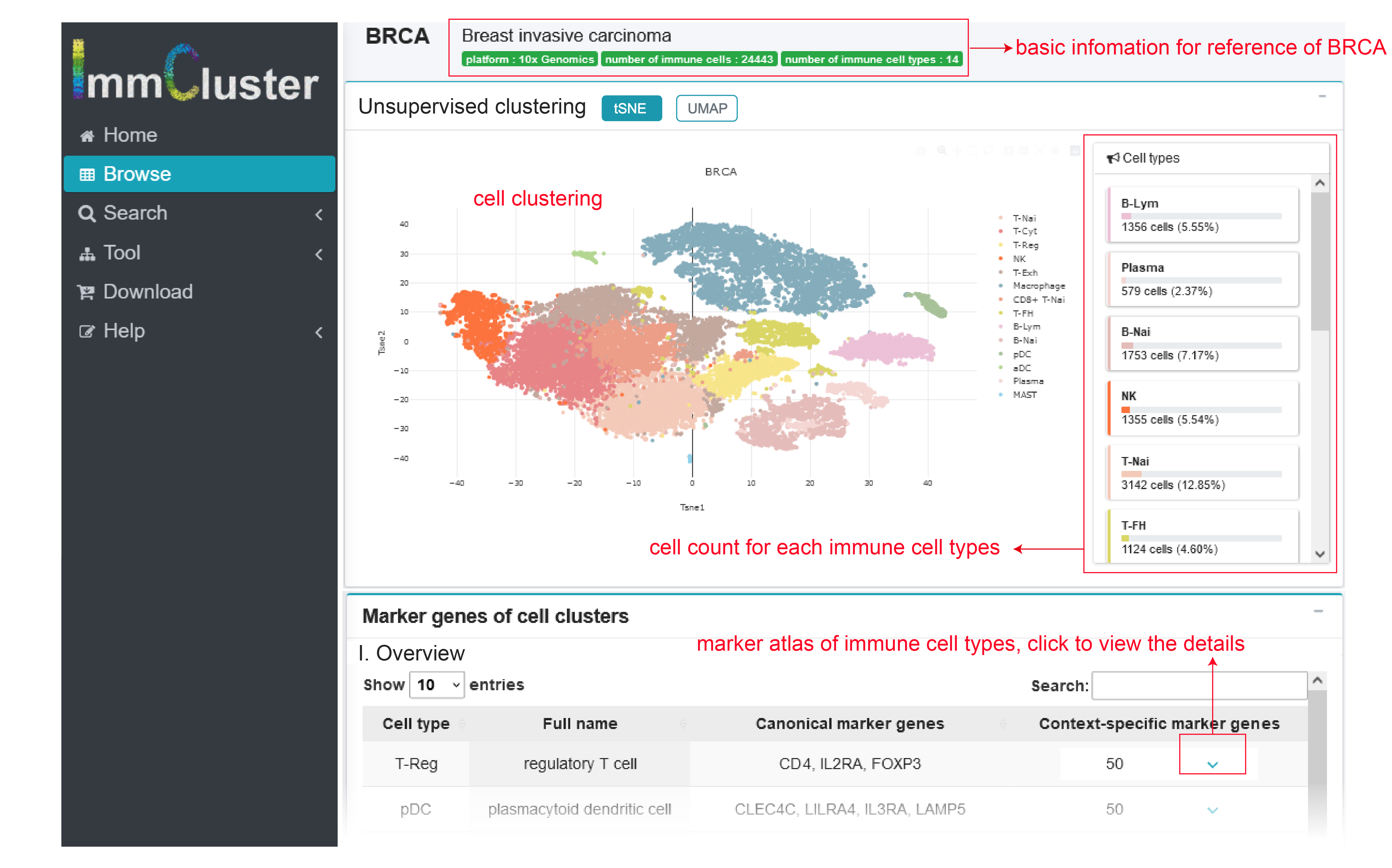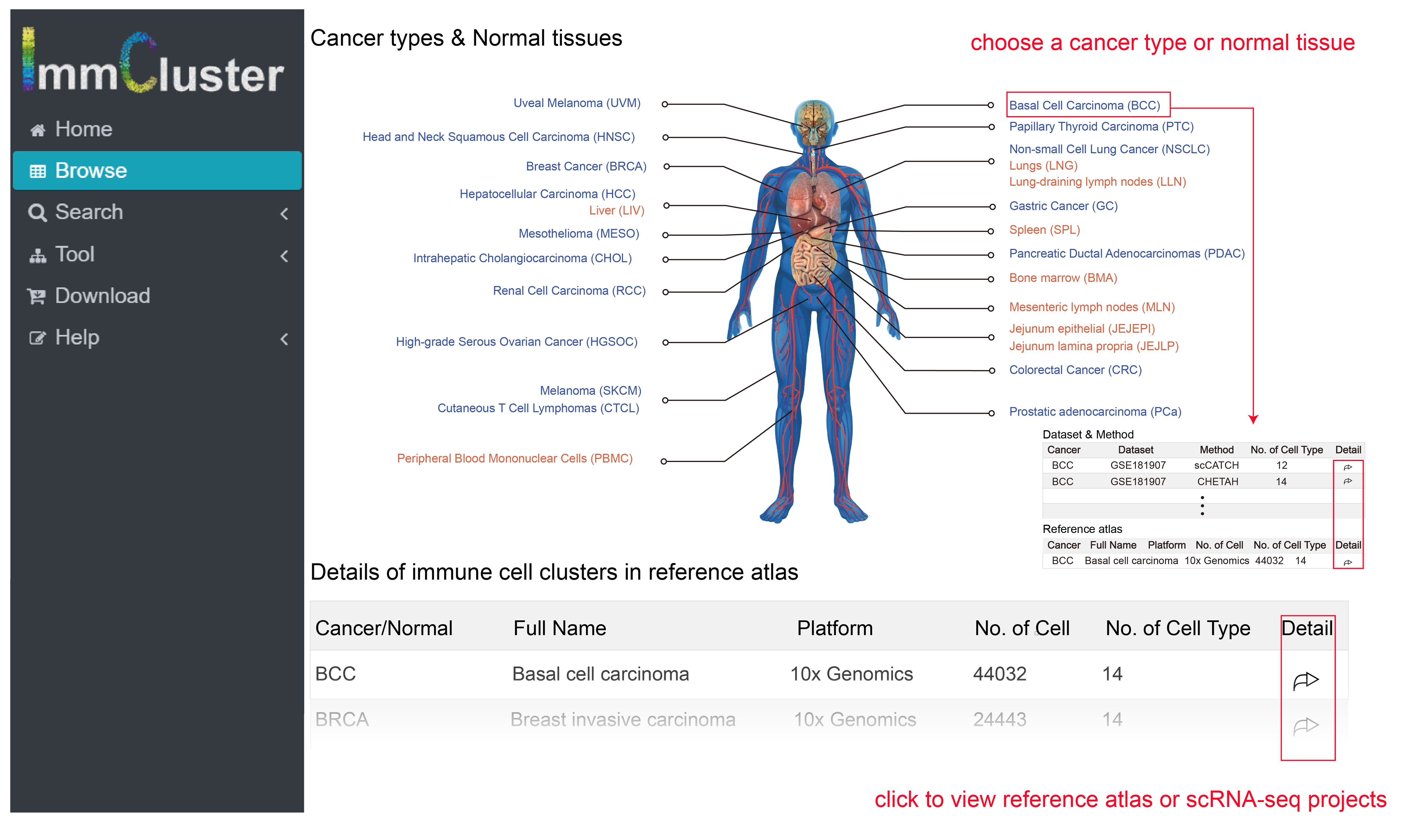 In the page Browse, users can choose one cancer type or normal tissue to view immune cell clusters with certain context. Similarly, users can click the options in table below with information button of data set.