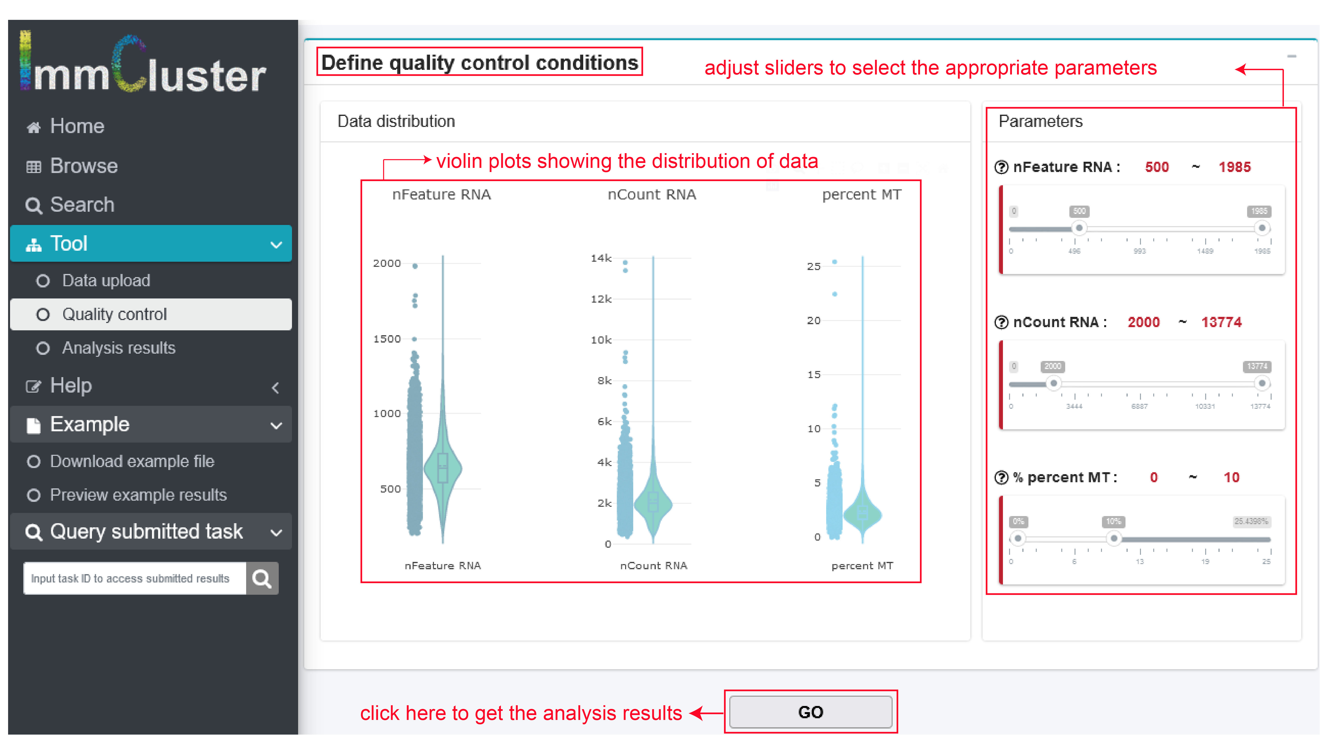 - Quality control. After data uploading and method selection, users can define quality control conditions according to data distribution by adjust the right sliders and GO.