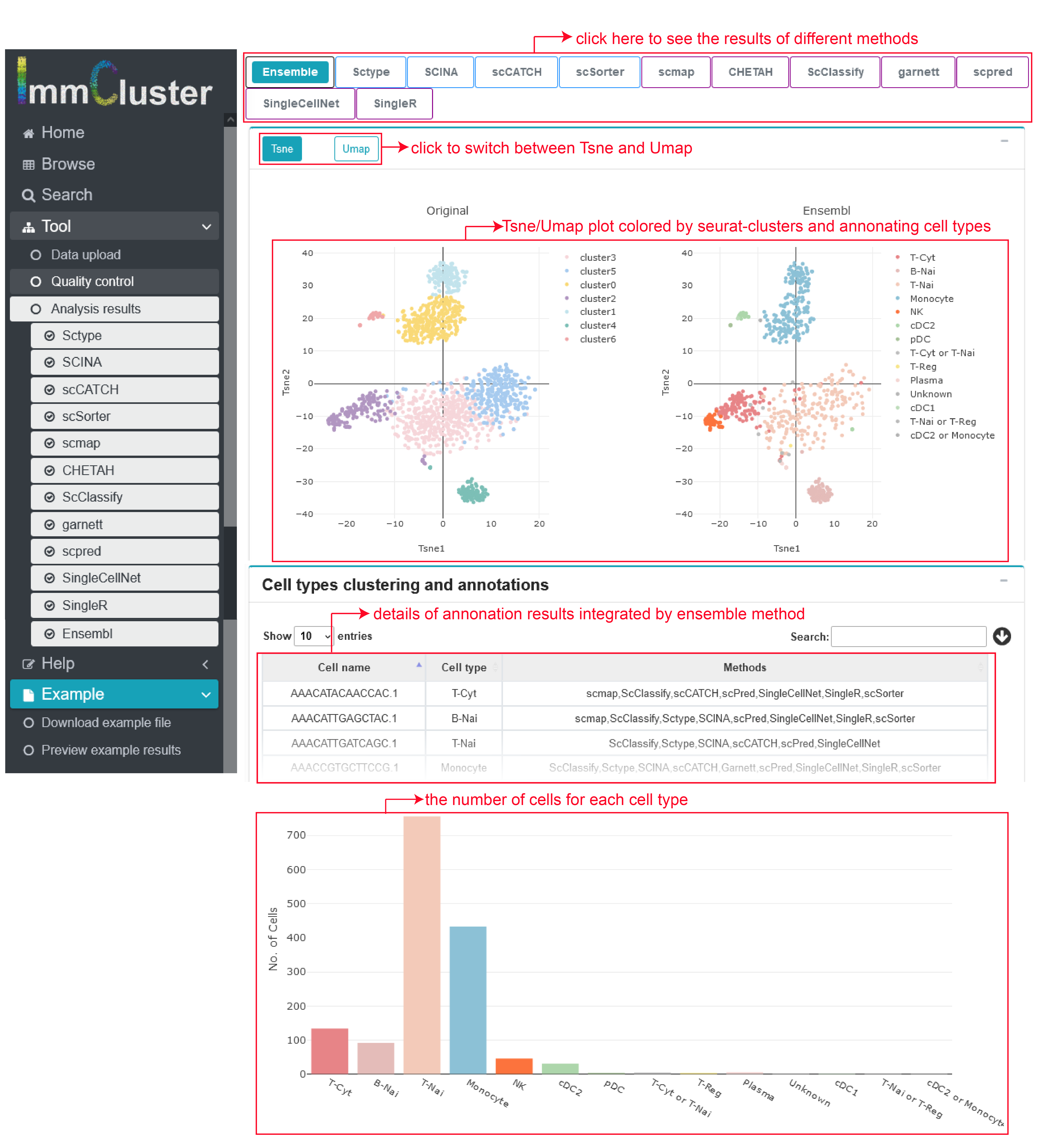 Firstly, two immune cell clustering plot, which represent clusters and annotated immune cell types of a certain method separately. Then, the annotating results for each cell can be check and downloaded in the following table and the barplot below gives the number of cells belonging to different cell types.