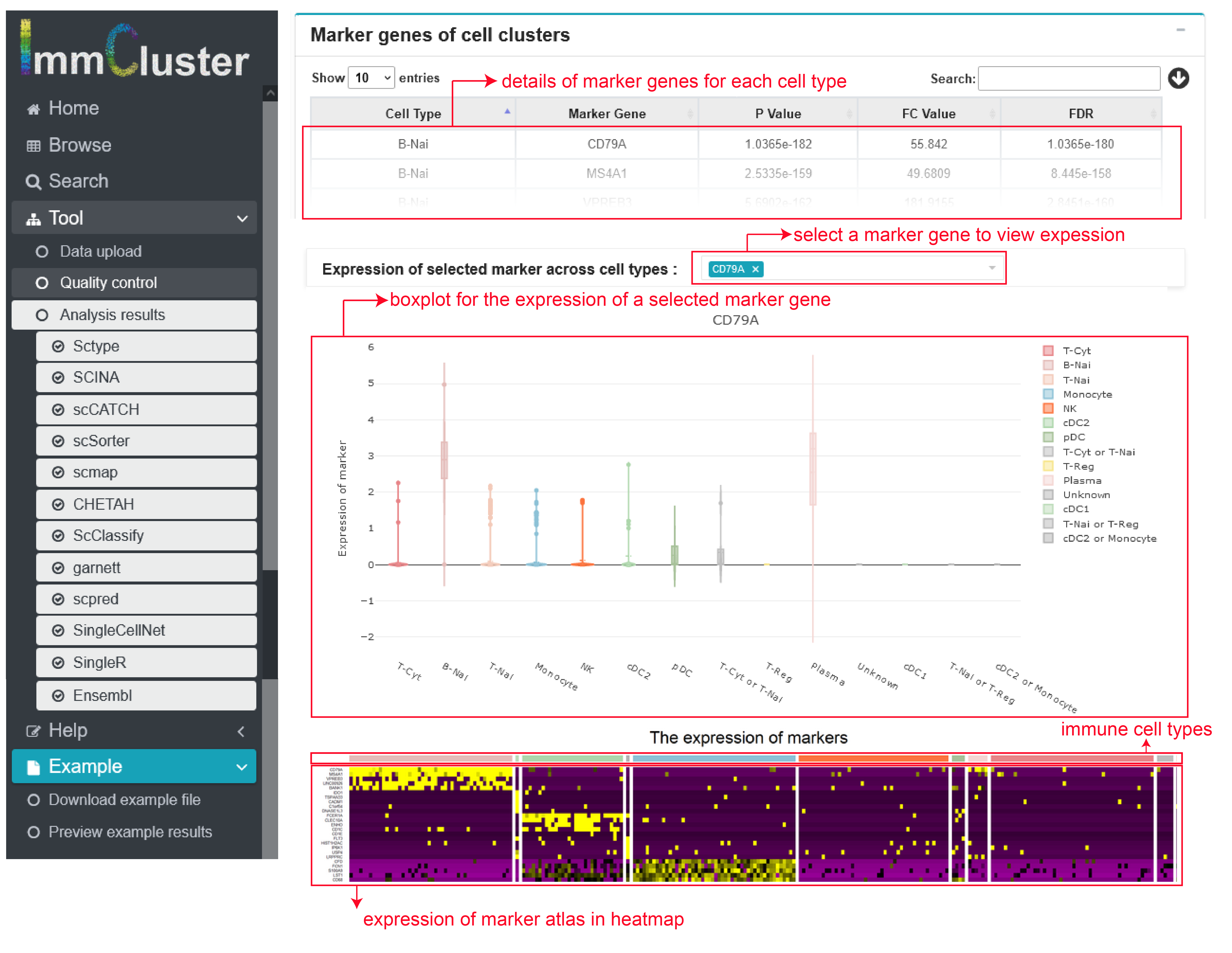 ImmCluster provided four major analytic modules that allow users to interactively explore the annotations of immune cells.