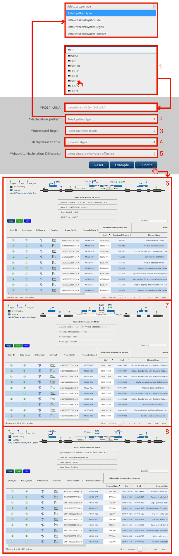 Click submit to get the result page in 6 (differential methylation site), 7 (differential methylation region) and 8 (differential methylation element).