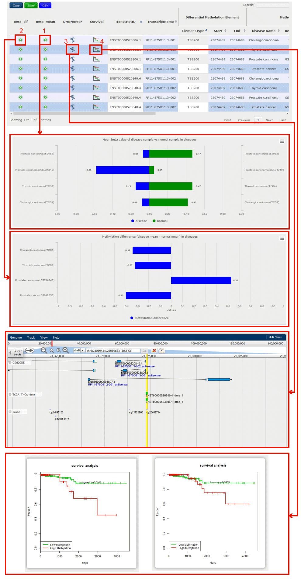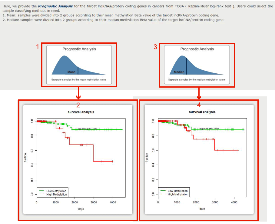 3. Click to get the survival analysis result, we seperate samples into 2 groups by the median methylation value of each sample, and users can get the result in 4 with the Kaplan–Meier log-rank p value.