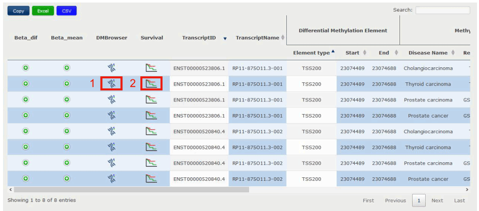 In the Transcript-Centric Search Result page, you can get the information of Transcript id, Transcript name, Differential Methylation Information, Methylation Status in Disease, and its Correlation with Expression.