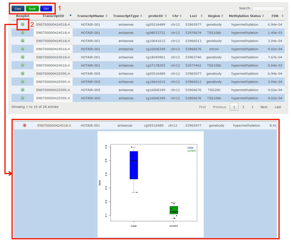 Figure 16-2 displayes the text result for the lncRNA/PCG, including transcript id, transcript name, transcript type, probe id, chromosome, probe loci, methylation region, methylation status and t test FDR value.