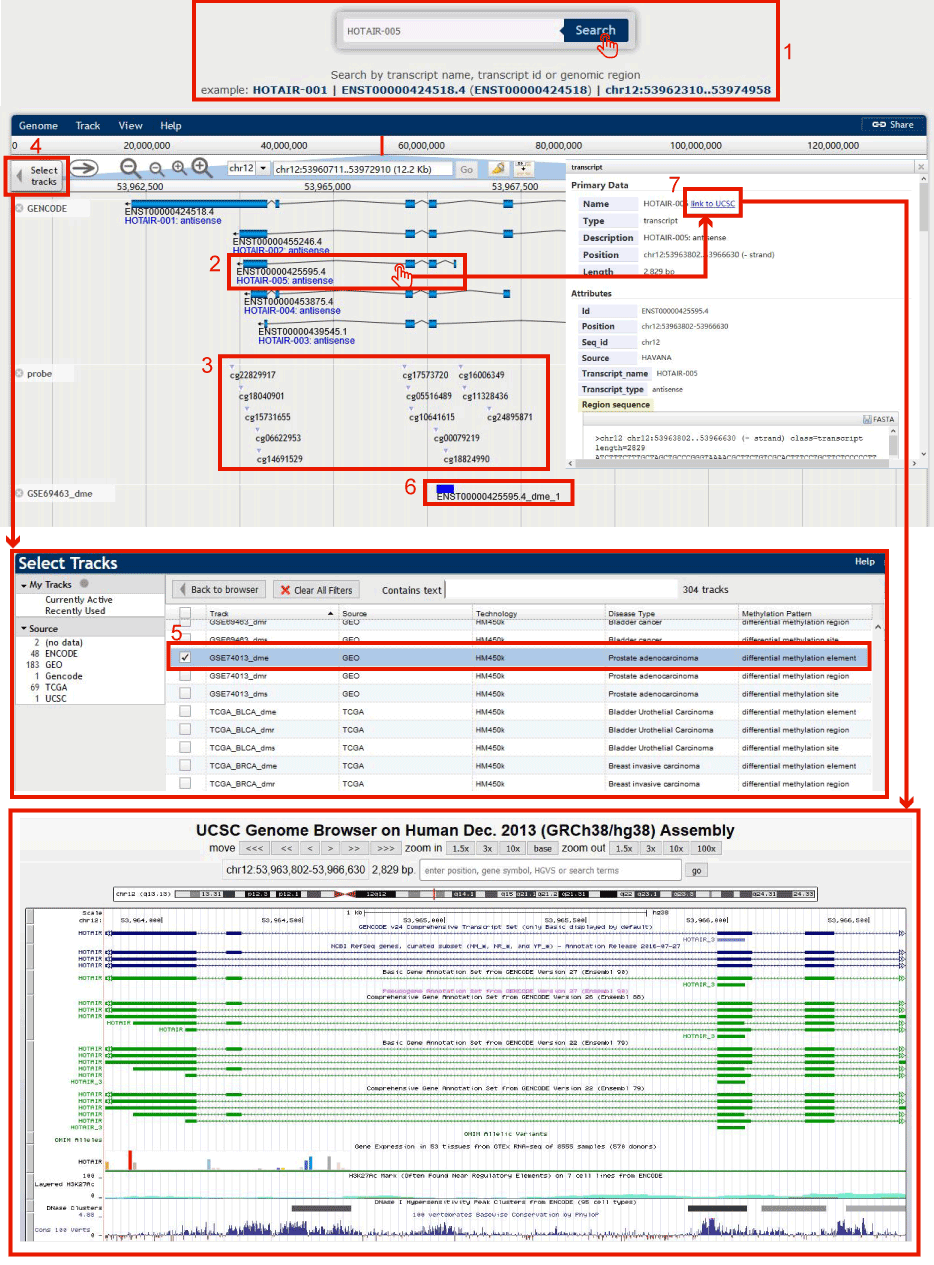 7. For the track of lncRNA transcripts, DMBrowser provides links to the UCSC Genome Browser for users further investigating the characteristics of the lncRNAs and methylation.