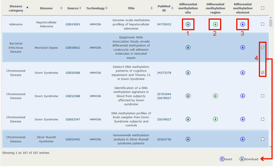 Download page displayed disease information, data source information and Pubmed ID.