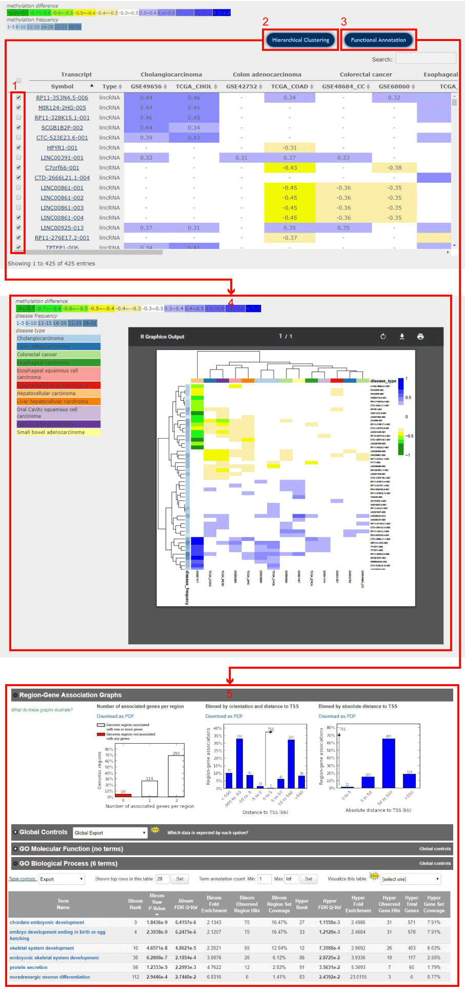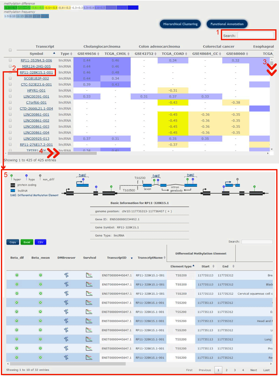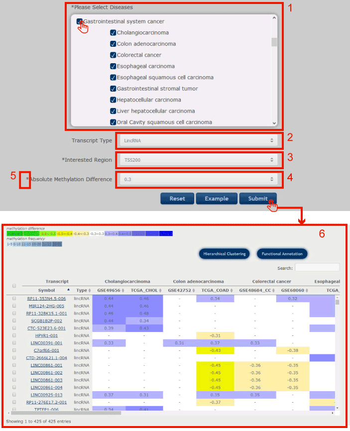In disease-centric result page, users can do Hierarchical Clustering and Functional Annotation by selecting interested differentially methylated transcripts.