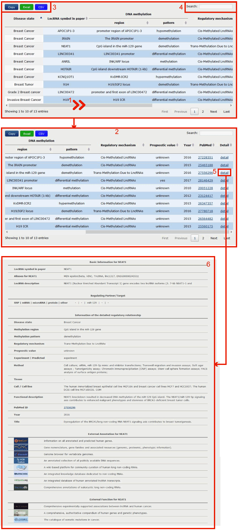 In the result page, all entries are listed with basic information including Disease state, LncRNA symbol in paper, DNA methylation region, DNA methylation pattern, Regulatory mechanism, Prognostic value, Year, PubMedID and link to the detail information.