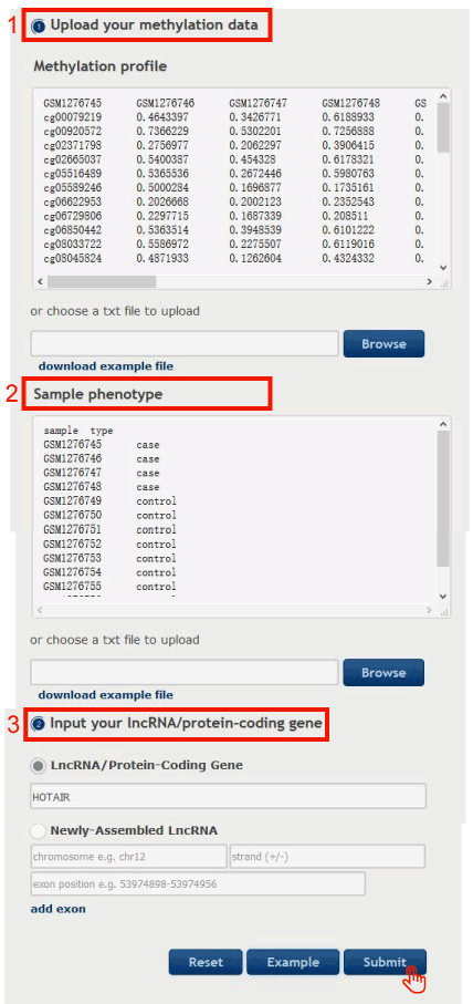 3. Upload Illumina Infinium 450k DNA methylation array data with the same format as our example data.