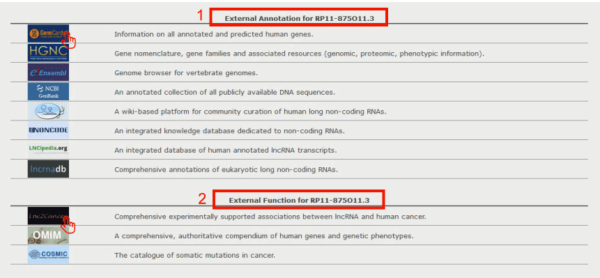 2. Users can search the external function information for the lncRNA by clicking on the corresponding hyperlink logo.