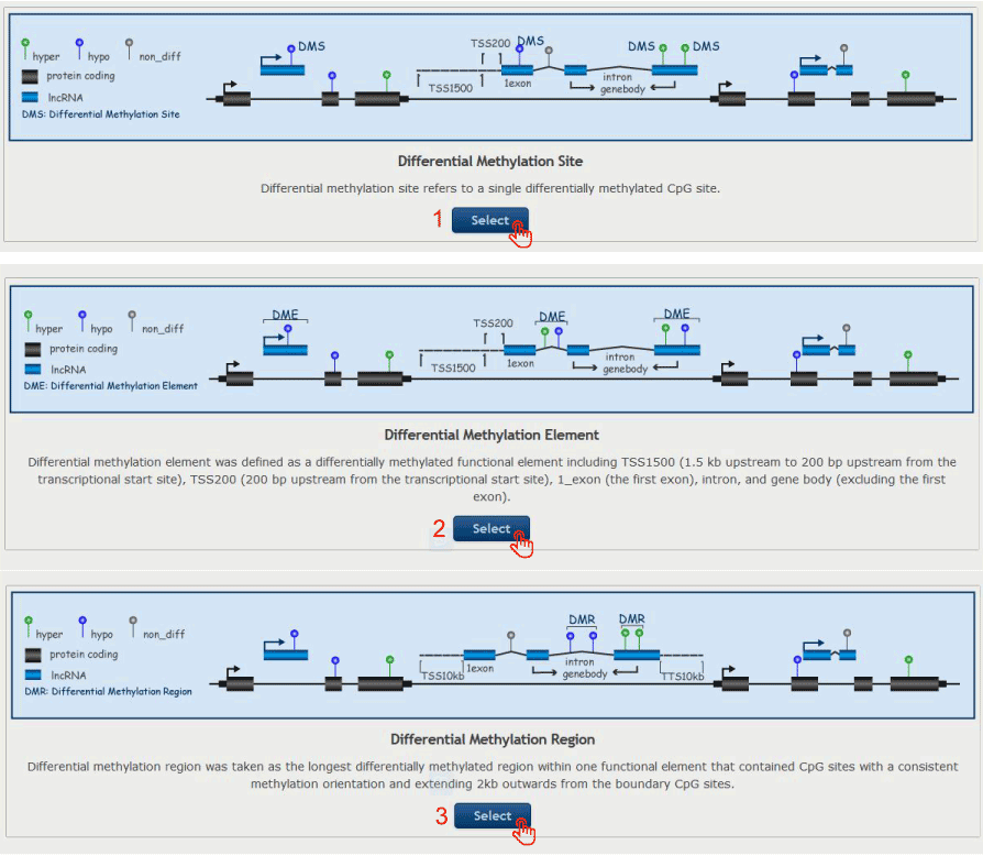 2. Click to select differential methylation pattern from Differential methylation site, Differential methylation region or Differential methylation element.