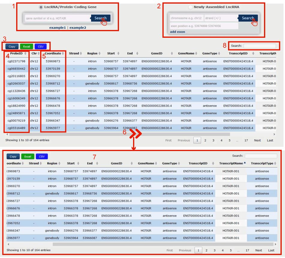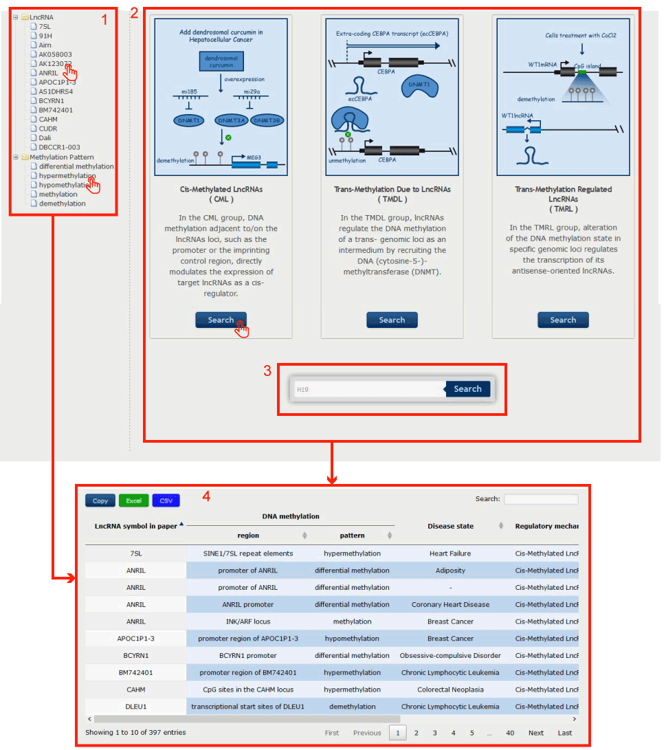 1. Click on the interested lncRNA name or the interested Methylation Pattern ( differential methylation, hypermethylation, hypomethylation, methylation, demethylation ) in the left menu to search.
