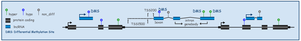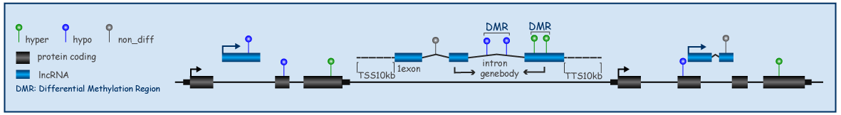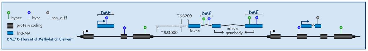 In this section, you could identify three types of the differential methylation patterns ( Differential Methylation Site, Differential Methylation Element and Differential Methylation Region) for your interested lncRNA/protein-coding gene. Select the pattern according to the following schematic illustrative examples: