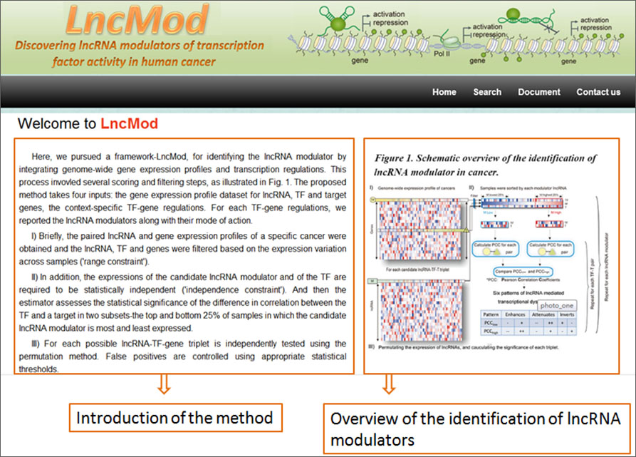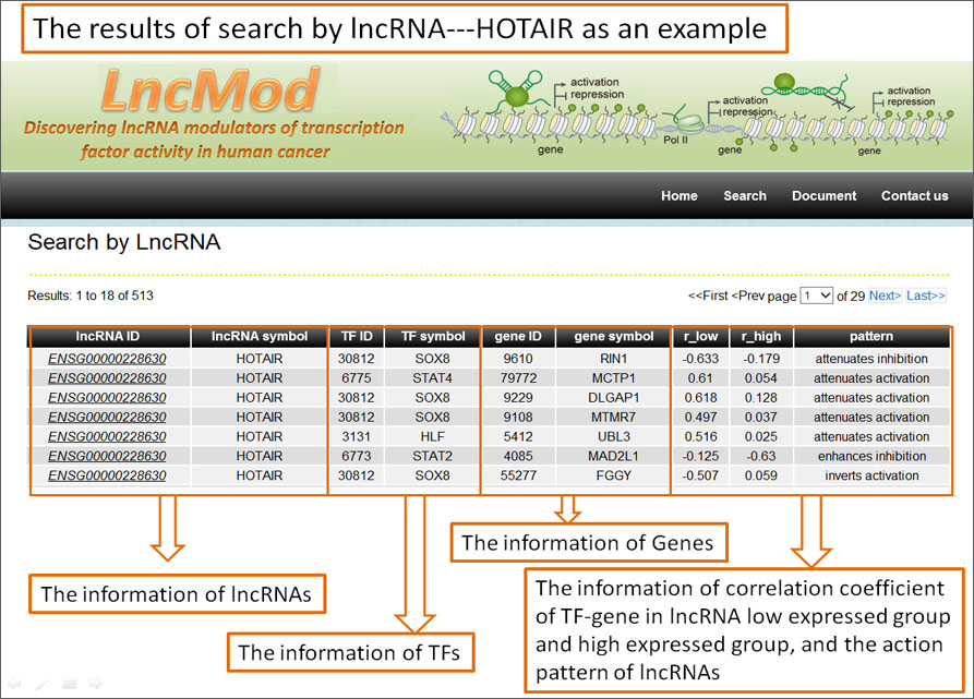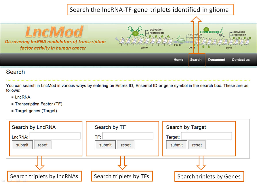 The LncMod provides an interface to retrieve the information about the lncRNA-TF-gene triplets in cancer. The current release of LncMod mainly contains the results in glioma. Users can search by individual lncRNA or by individual TF or by individual genes to view the lncRNA-TF-gene associations. |