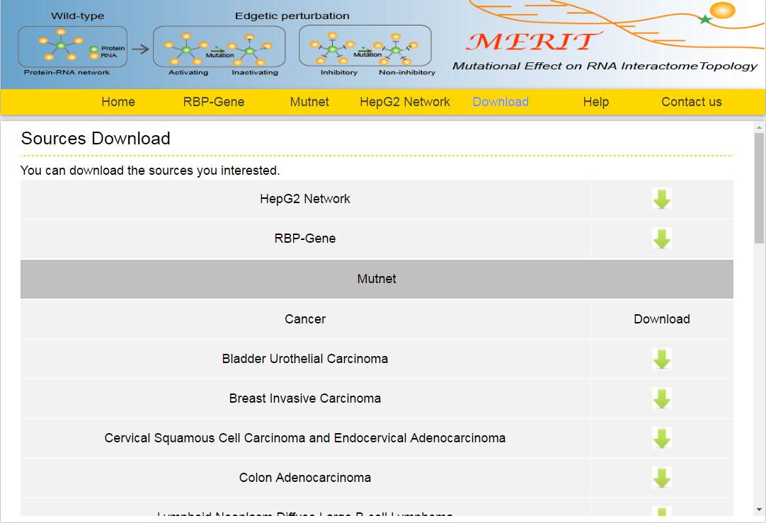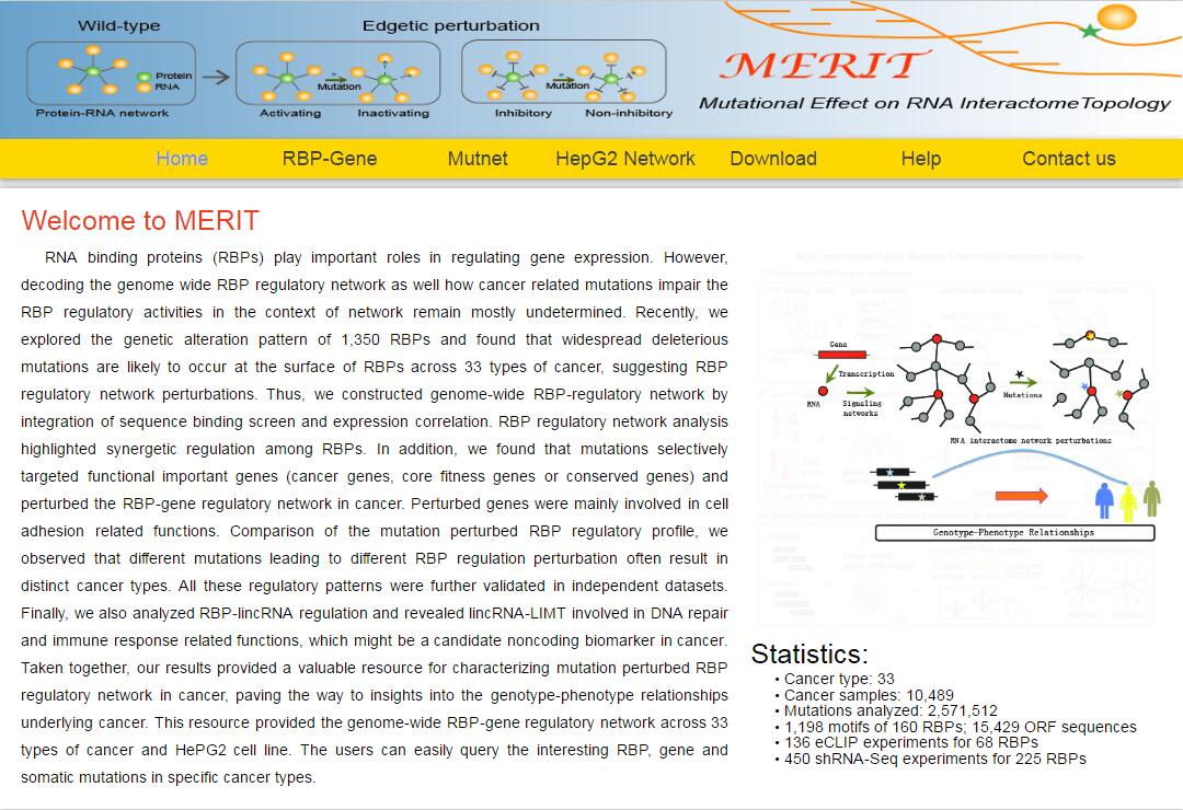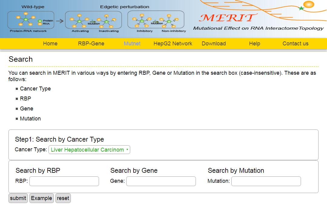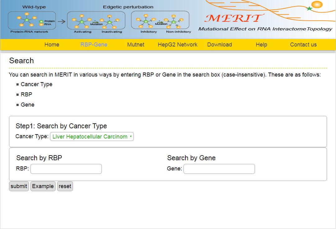 The MERIT provides an interface to retrieve the information about the RBP-Mutation-Gene triplets in cancer. The current release of MERIT mainly contains the results in 28 kinds of cancer. Users can search by individual RBP or by mutation or by individual gene to view the RBP-Mutation-Gene association in a certain cancer. Here, we provide an example where users can click on "examples" and "submit", to check out the information about triplets.
