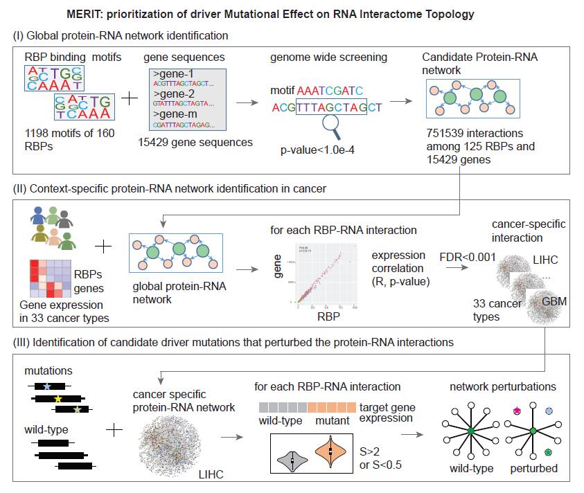 Here, we proposed a three-step computational method (MERIT) to identify the candidate driver mutations that perturbed the protein-RNA interaction network in cancer. Step-1: Firstly, the 1,350 genes coding for RNA binding proteins analyzed in this study were obtained from a recent study (1), including those with high confidence for RNA binding and genes annotated as RNA binding in Ensembl. To identify the genome-wide RBP-gene regulation in cancer, we firstly retrieved the 1,198 motifs of 160 human RBPs from ATtRACT database (2). In addition, genome-wide sequences of 15,429 genes were obtained from one of the previous studies (3). The FIMO program was used to search these sequences for occurrences of known RBP motifs (4). Motifs with Benjamini and Hochberg adjusted p-values less than 1.0e-4 were regarded as binding sites in the gene. Step-2: Emerging evidence indicated that if genes were regulated by RBPs, their expression levels should be correlated (5,6). Thus, we integrated genome-wide expression of RBP and genes to investigate the context-specific RBP-gene regulation in each cancer types. Here, we explored the regulation via spearman correlation method. For each pair of RBP-gene predicted above, we computed the spearman correlation coefficient (R) as follow: R(x,y)=cov(RX,RY)/(σRX*σRY) =E[(RX-μRX)(RY-μRy)]/(σRX*σRY) =(E[(RX-μRX)(RY-μRy)])/(√(E[〖RX〗^2 ]-〖[E[RX]]〗^2 ) √(E[RY^2 ]-〖[E[RY]]〗^2 )) Where RX was the rank of expression for RBP x in samples and RY was the rank of expression for gene y in samples. μRX and μRY were the mean rank of RBP x and gene y. σRX and σRY were the standard deviation of RX and RY. E was the expectation. All the candidate RBP-gene pairs with P-adjusted<0.01 were identified as RBP-gene regulation in each cancer type. Step-3: To identify the somatic mutation mediated RBP-gene interactions, we started with a hypothesis that mutations located in the RNA binding sites were likely to disrupt the RBP binding. Disruption of RBP binding might affect the expression of target genes. Based on the expression correlation in each cancer type, we divided the RBP-gene pairs into two groups: one contained the RBPs promoting the expression of target genes, and the other contained RBPs inhibiting the expression of target genes. Next, we divided the cancer samples based on whether the sample had a specific mutation. The expression levels of target gene k were compared between the mutated group and the normal group and the expression alteration score (S) was calculated as follow: S(k)=M ̅_k/W ̅_k =(∑_(i=1)^m▒〖x_i/m〗)/(∑_(j=1)^w▒〖x_i/w〗) Where the m and w is the number of mutated samples and wild-type samples. If the expression levels of target genes showed 2-fold reduction (S<0.5) in the mutated group and the RBP promoted the expression of the target genes in normal samples, we defined these pairs as decreased activation. In contrast, if the expression levels of target genes showed 2-fold increase (S>2) in the mutated group and the RBP inhibited the expression of the target genes in normal samples, we defined these pairs as decreased inhibition. All the RBP-target gene pairs were assembled as mutation-mediated RBP-gene interaction rewiring.