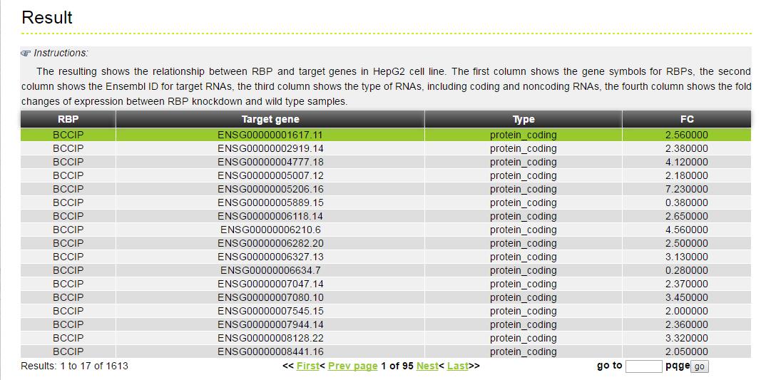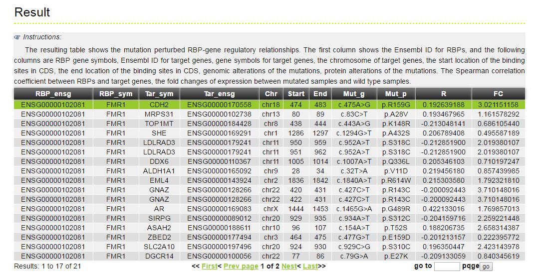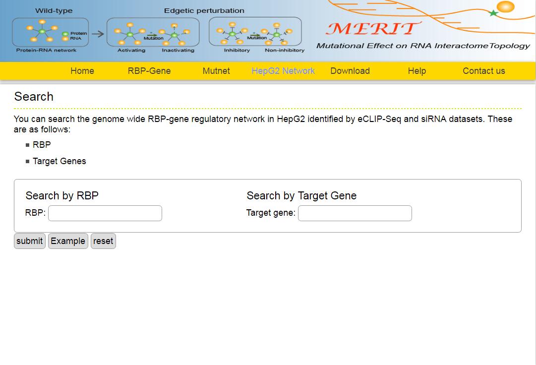 The MERIT provides an interface to retrieve the information about the RBP-(Target Genes). Users can search by individual RBP or by target gene to view the RBP-(Target Gene) association. Here, we provide an example where users can click on "examples" and "submit", to check out the information about association.