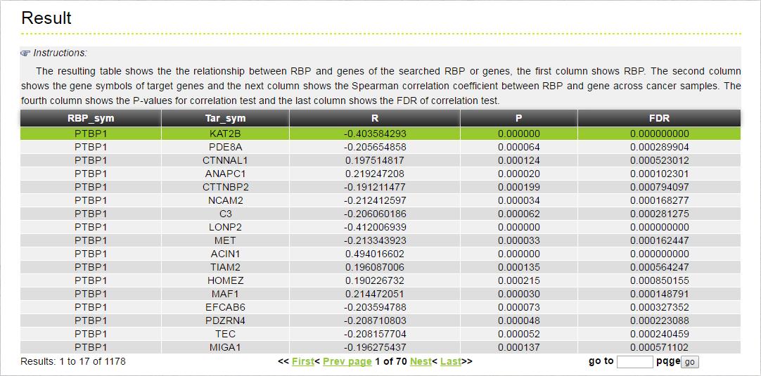 The MERIT provides an interface to retrieve the information about the RBP-Gene in cancer. The current release of MERIT mainly contains the results in 33 kinds of cancer. Users can search by individual RBP or by individual gene to view the RBP-Gene association in a certain cancer. Here, we provide an example where users can click on "examples" and "submit", to check out the information about association.