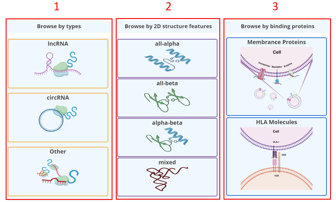 For the browse page, we provide ncRNA encoded microprotein by ncRNA types, 2D structure features, or by peptides bound by MHC I or membrane protein.